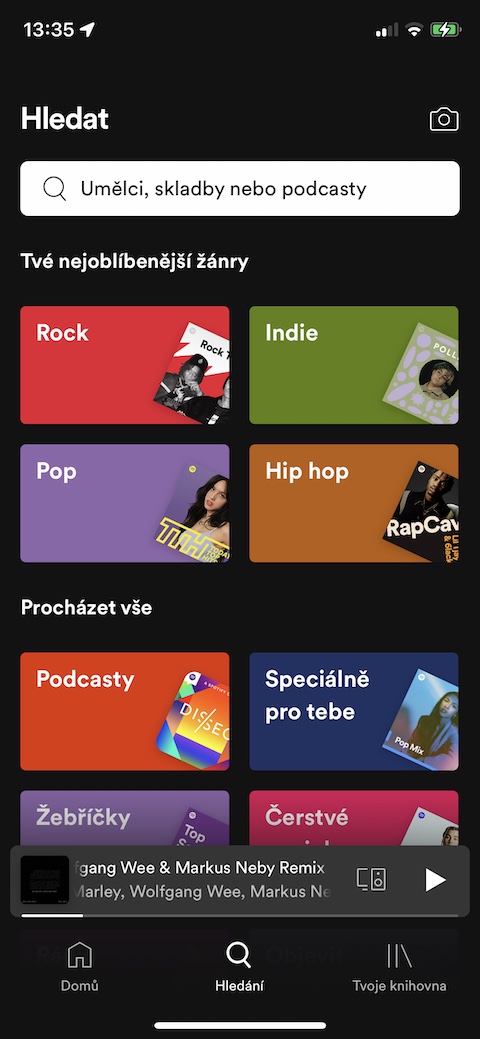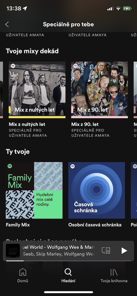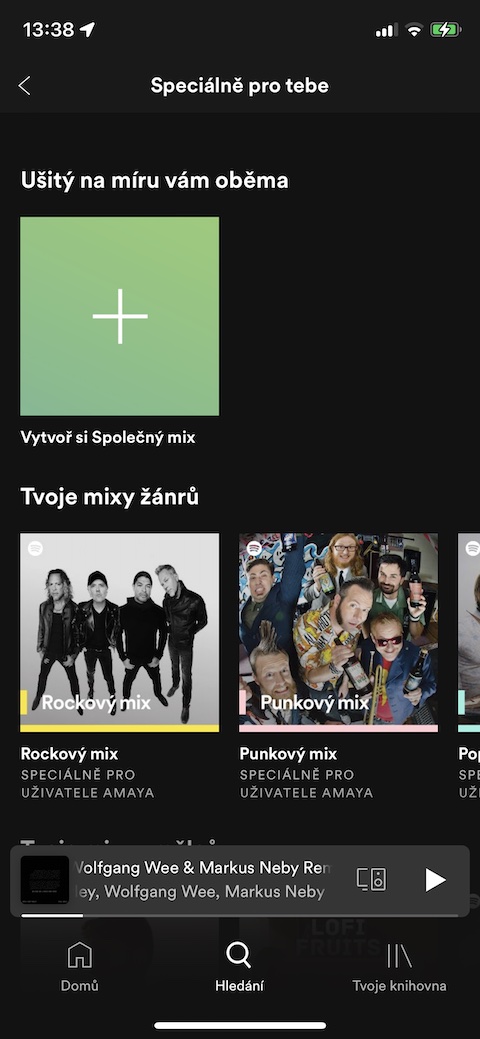 Spotify si velice dobře pamatuje, jaké skladby nejčastěji posloucháte a jaké skladby přidáváte do seznamu oblíbených. Na základě tohoto pozorování pro vás pak automaticky vytváří výběry skladeb, které by se vám mohly líbit. Tyto výběry si můžete poslechnout poté, co ve středu lišty ve spodní části klepnete na Hledání a poté zvolíte Speciálně pro tebe.