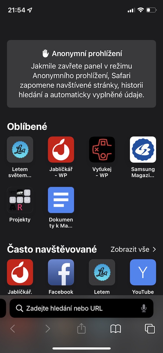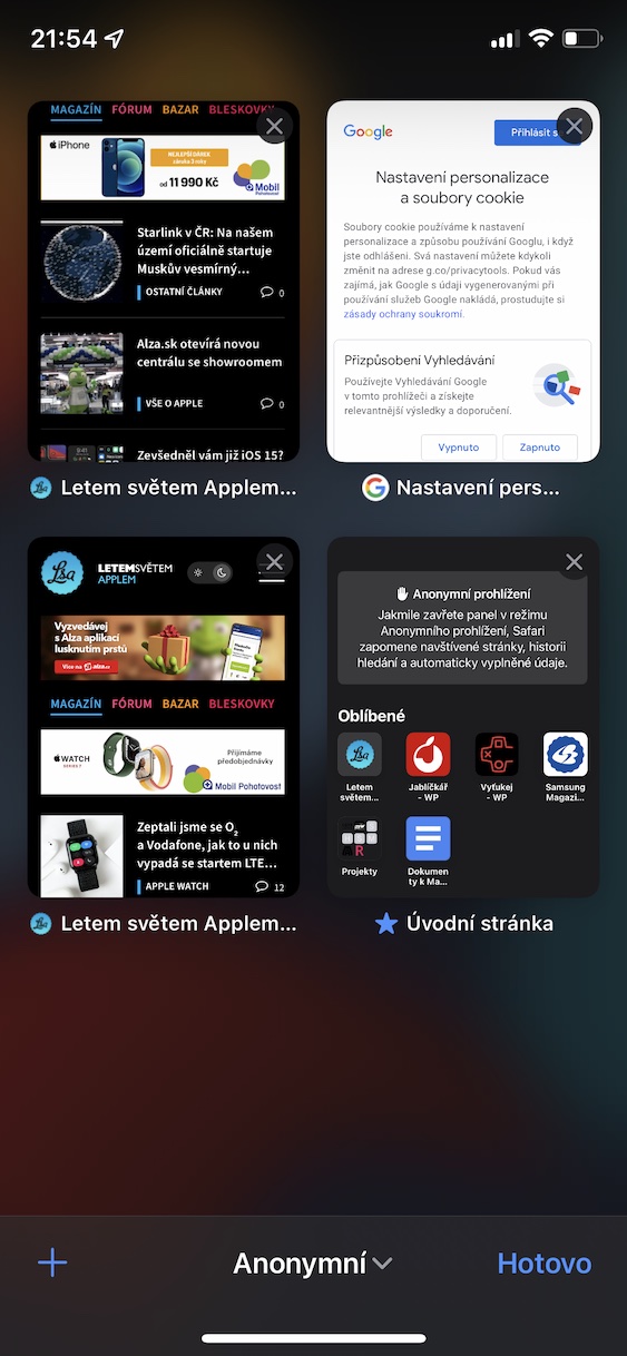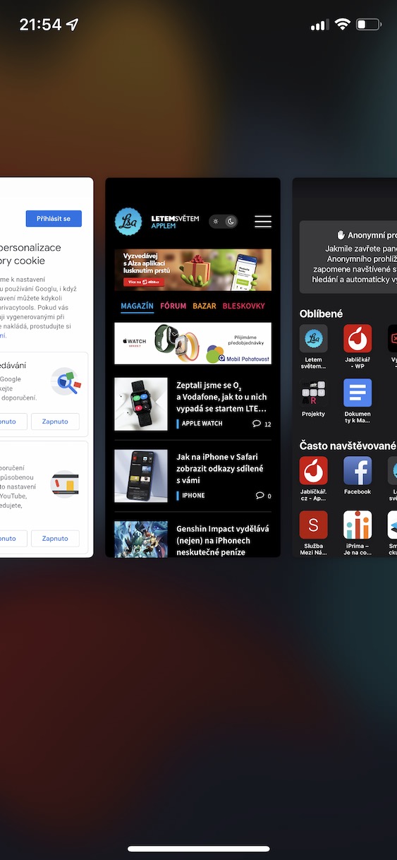 V Safari z iOS 15 došlo k přepracování zobrazení přehledu panelů. Zatímco ve starších verzích iOS se veškeré otevřené panely zobrazovaly v zobrazení jakéhosi vějíře, tak nově jsou panely naskládané přehledně do mřížky. Pokud se chcete na tento přehled panelů dostat, tak stačí, abyste klepnuli po ikonu dvou čtverců v pravé dolní části obrazovky. I v tomto případě je ale možné využít také gesto. Pro otevření přehledu panelů pomocí gesta položte prst na adresní řádek, a poté ním přejeďte směrem nahoru. Následně prst z obrazovky pusťte, čímž se zobrazí rozhraní přehledu otevřených panelů.
