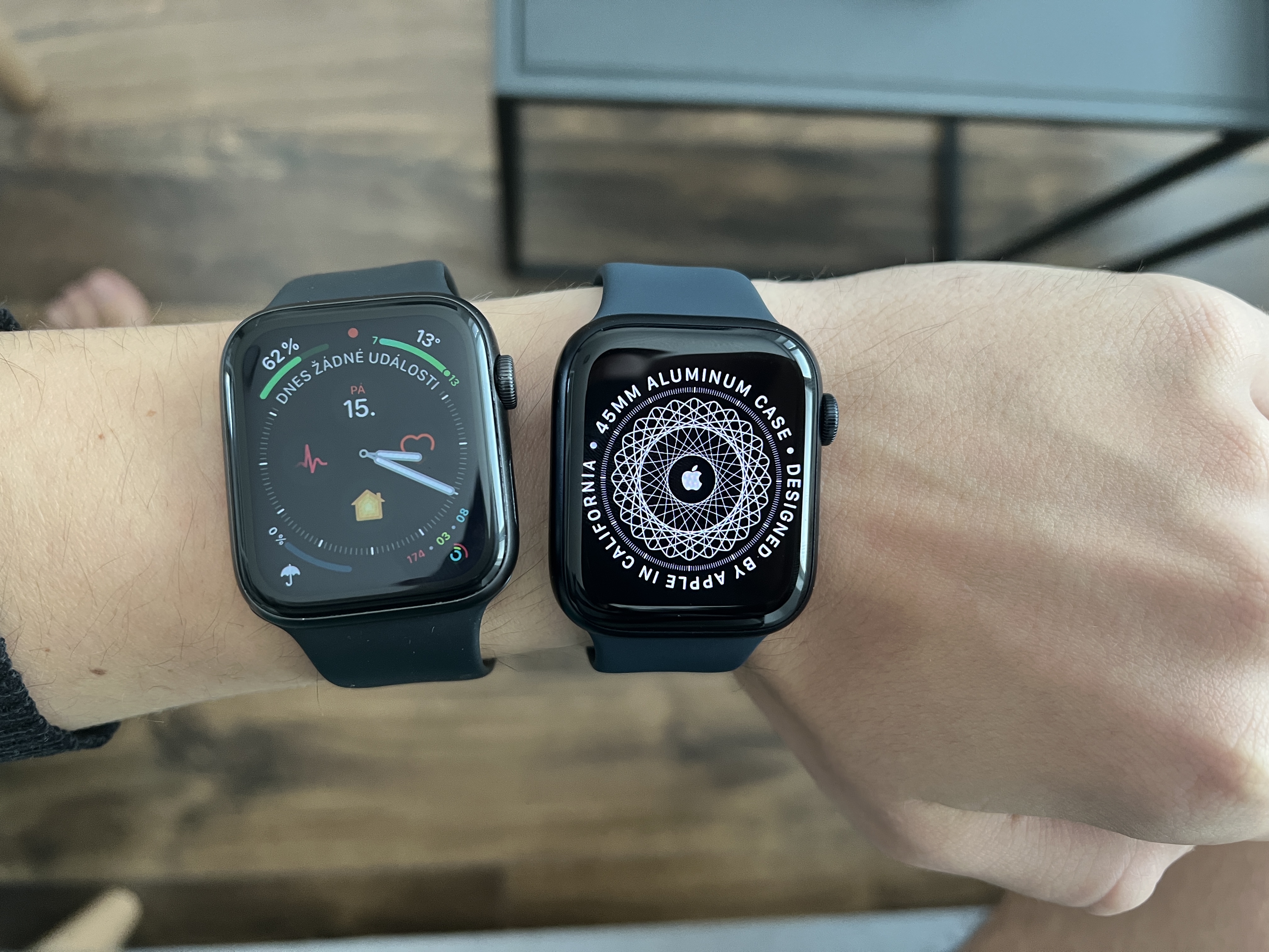 Mně na testy přistála konkrétně větší temně inkoustová varianta, kterou musím subjektivně zhodnotit jako opravdu povedenou. Oproti mé vesmírně šedé ze Series 5 je nový odstín výrazně tmavší, díky čemuž působí celistvějším dojmem, jelikož se černý displej daleko lépe sjednocuje s tmavým hliníkovým (a relativně lesklým) tělem. Za barvu tedy musím dát Applu palec nahoru, byť se jedná jednak o ryze subjektivní hodnocení a jednak o svým způsobem drobnost, která nehraje žádnou velkou roli. Co se pak týče velikosti, jsem zvyklý vždy na větší modely Watch a tudíž jsem si od Mobil Pohotovosti nechal poslat 45 mm variantu s tím, že jsem před rozbalením tak nějak čekal, že rozdíl alespoň trochu poznám. Když jsem však hodinky nasadil na zápěstí, měl jsem z nich rozměrově naprosto stejný pocit jako ze Series 4, 5 či 6. Pokud vám tedy rozměry starších Watch sedí, nemusíte se obávat, že by milimetr navíc u každé velikostní varianty (k dispozici je rovněž menší 41mm varianta nahrazující předešlou 40mm) tělo nějak výrazně zvětšil – absolutně si toho totiž nevšimnete. Zda je to škoda či nikoliv už nechám na každém z vás.