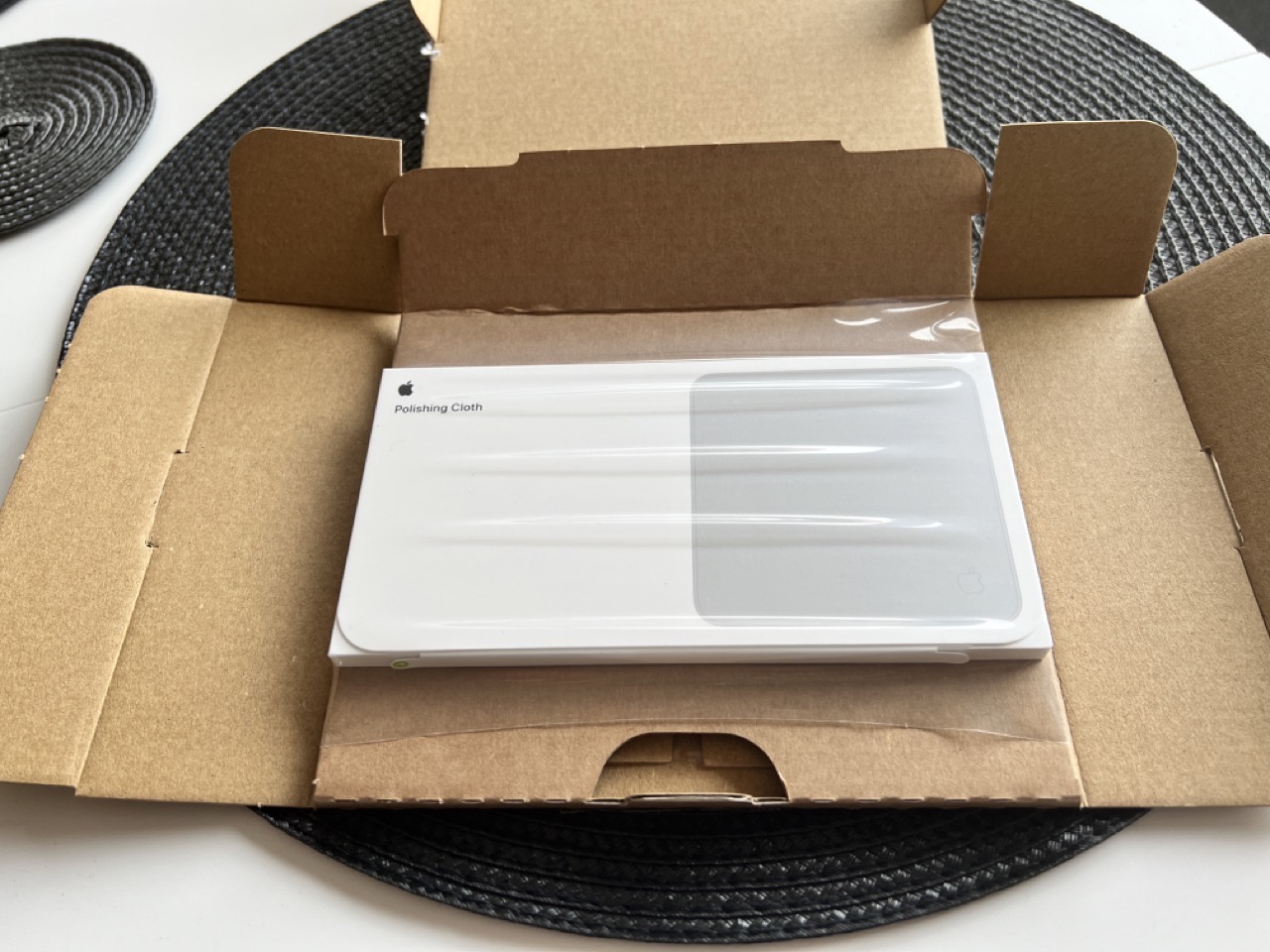 Přiznám se, že když jsem od rána sledoval na Twitteru fotky balení hadříku, měl jsem dojem, že je poměrně velké a že i samotný hadřík na tom není z hlediska rozměrů špatně. O to víc mě překvapilo, když mi kurýr před malou chvílí přivezl poměrně malý balíček s prakticky nulovou hmotností. Po jeho otevření pak přišlo poměrně rychlé vystřízlivění. Balení hadříku je opravdu malé a i když vypadá na pohled hezky, jelikož je na něm rukopis Applu vidět, při pohledu na něj je vám prakticky hned jasné, že ani jeho obsah nemůže být logicky příliš velký. A také není. Po stržení bočního jistícího papírku a následném rozevření papírové krabičky se vám totiž do rukou dostane v půli přeložený šedý hadřík o rozměrech 16 x 16 centimetrů. V galerii jej porovnávám s krabičkou od iPhonu 13 Pro Max a Apple MagSafe Wallet 2. generace.