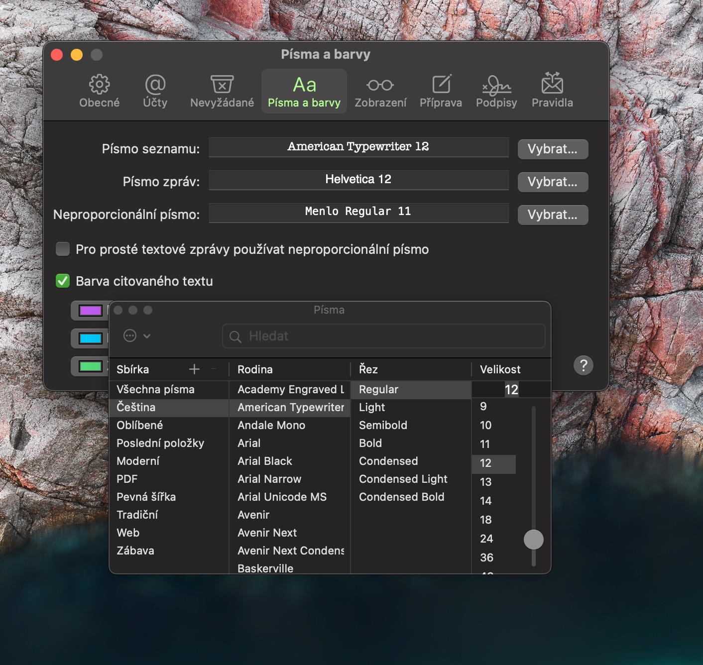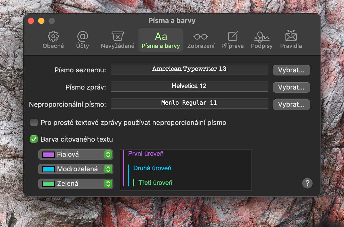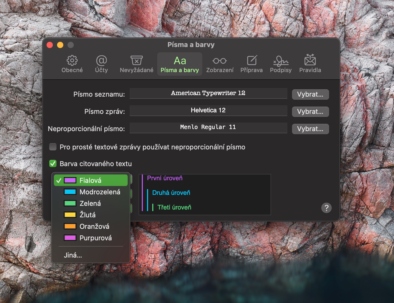 Pokud vám z jakéhokoliv důvodu nevyhovuje standardní zobrazení písma a barev v prostředí nativní aplikace Mail na vašem Macu, můžete to snadno změnit. V horní části obrazovky vašeho Macu opět klikněte na Mail -> Předvolby. V horní části okna, které se vám zobrazí, tentokrát zvolte Písma a barvy.