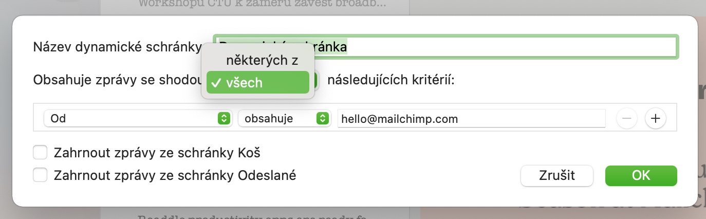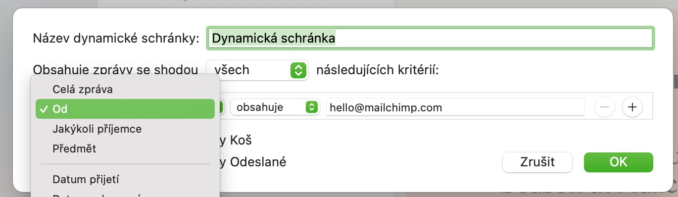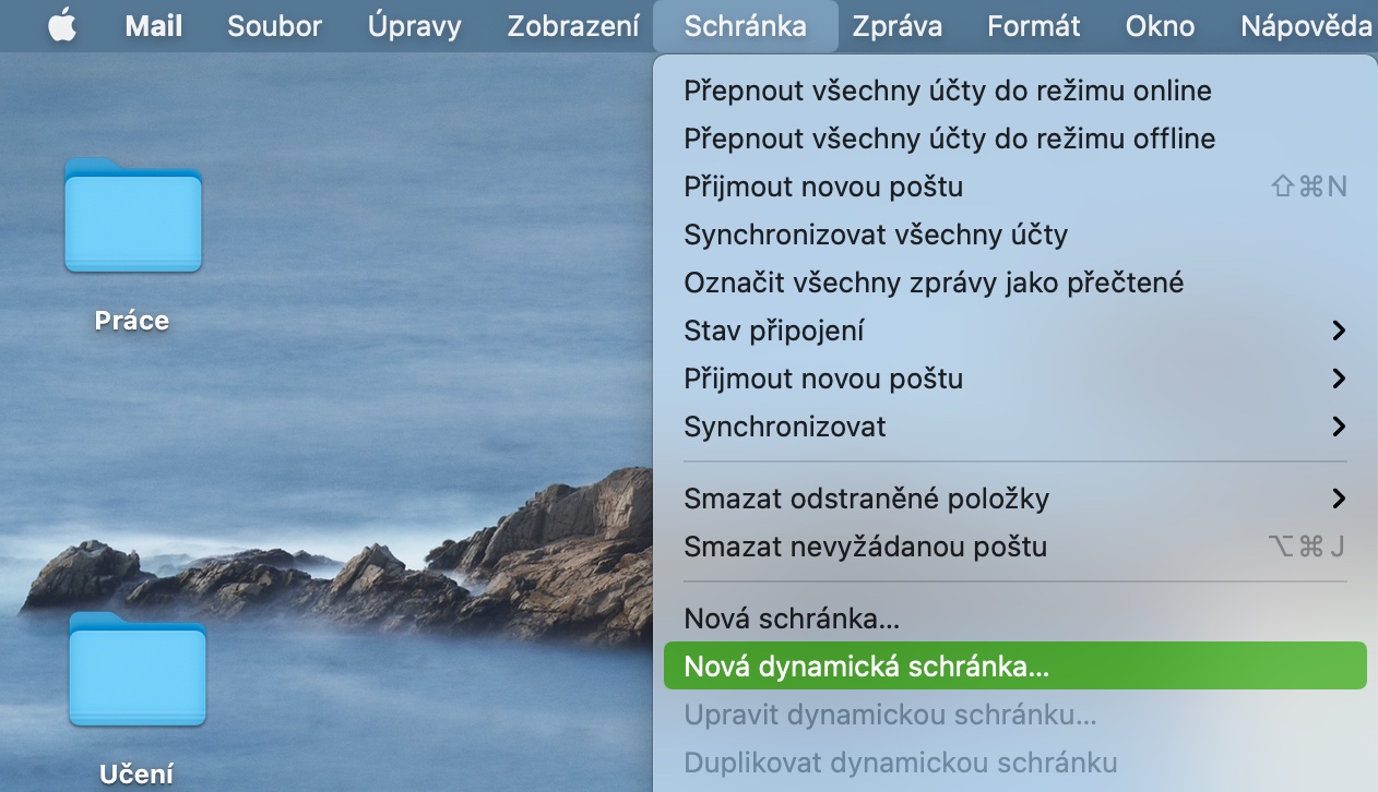 Velmi užitečnou funkcí, kterou nabízí nativní Mail na Macu, jsou takzvané dynamické schránky. Tato funkce vám umožní rychlé a jednoduché stanovení podmínek, za jakých má docházet k řazení zpráv do schránek. Na nástrojové liště v horní části obrazovky vašeho Macu klikněte na Schránka -> Nová dynamická schránka. V menu, které se vám zobrazí, poté stačí už jen navolit veškeré potřebné podmínky.