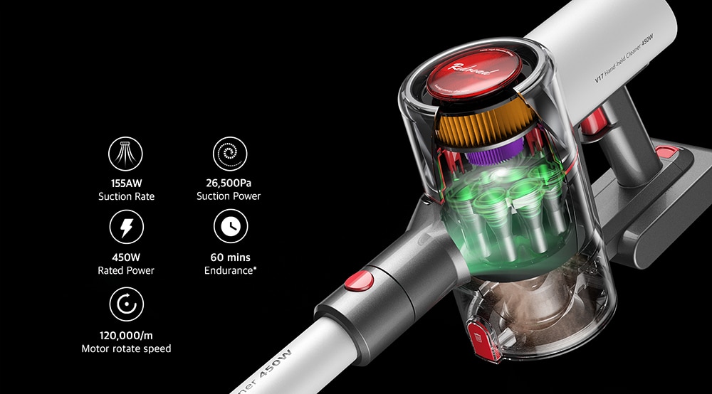 Příjemně potěšit dokáže i síla samotného vysavače, díky které doslova neuteče byť jen jediné smítko prachu. Za tím stojí výkonný motor, který dokáže fungovat v otáčkách 120 000 RPM, kdy generuje sání 155 AW a tlak 26 500 Pa. Již při pohledu na samotná čísla je jasné, že se jedná o ten nejlepší možný model v dané cenové kategorii. Tento výkon je více než dostačující pro běžné uklízení domova. Redroad V17 je tak skvělou volbou pro rodinné domy.