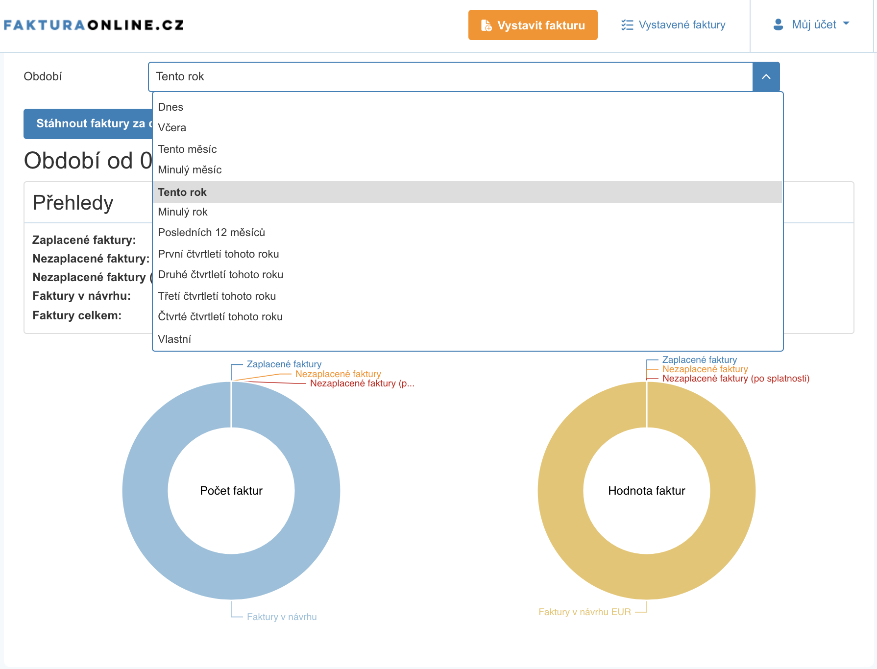 Důležitou novinkou jsou grafické přehledy vystavených faktur. Uživatel si může vybrat z různých přednastavených období, za které chce přehled zobrazit, nebo si zvolit vlastní časový rámec. Všechny vystavené faktury, včetně návrhů se poté seskupí podle jejich stavů do výpisu a grafu.