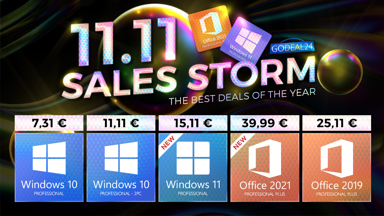Godeal24 již nyní odstartoval speciální slevovou akci Double 11 Crazy s cenami, které si zkrátka nemůžete nechat ujít. Níže tak naleznete ty nejlepší slevy, jež by vaší pozornosti rozhodně neměly uniknout a tuto šanci byste tak promrhat neměli. V rámci této akce si tak můžete pořídit originální a doživotní licence na Windows 10 Pro, Office 2019 Professional Plus a Office 2021 Professional Plus. Například Windows 10 Pro je k dostání za pouhých 5,55 €.