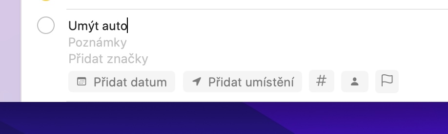 Chcete-li na Macu v Připomínkách přidat novou připomínku, tak se stačí přesunout do vybraného seznamu, a poté vpravo nahoře klepnout na ikonu +. Následně se kurzorem ocitnete v řádku s novou připomínkou, kde se vyplňuje název a případně poznámka, společně se značkami. Kromě toho si ale níže můžete ještě v panelu nástrojů nově vybrat datum, umístění, značku či vlaječku. Pokud máte sdílenou poznámku, tak ještě navíc můžete vybrat uživatele, se kterým se připomínka pojí, a to klepnutím na ikonu panáčka.