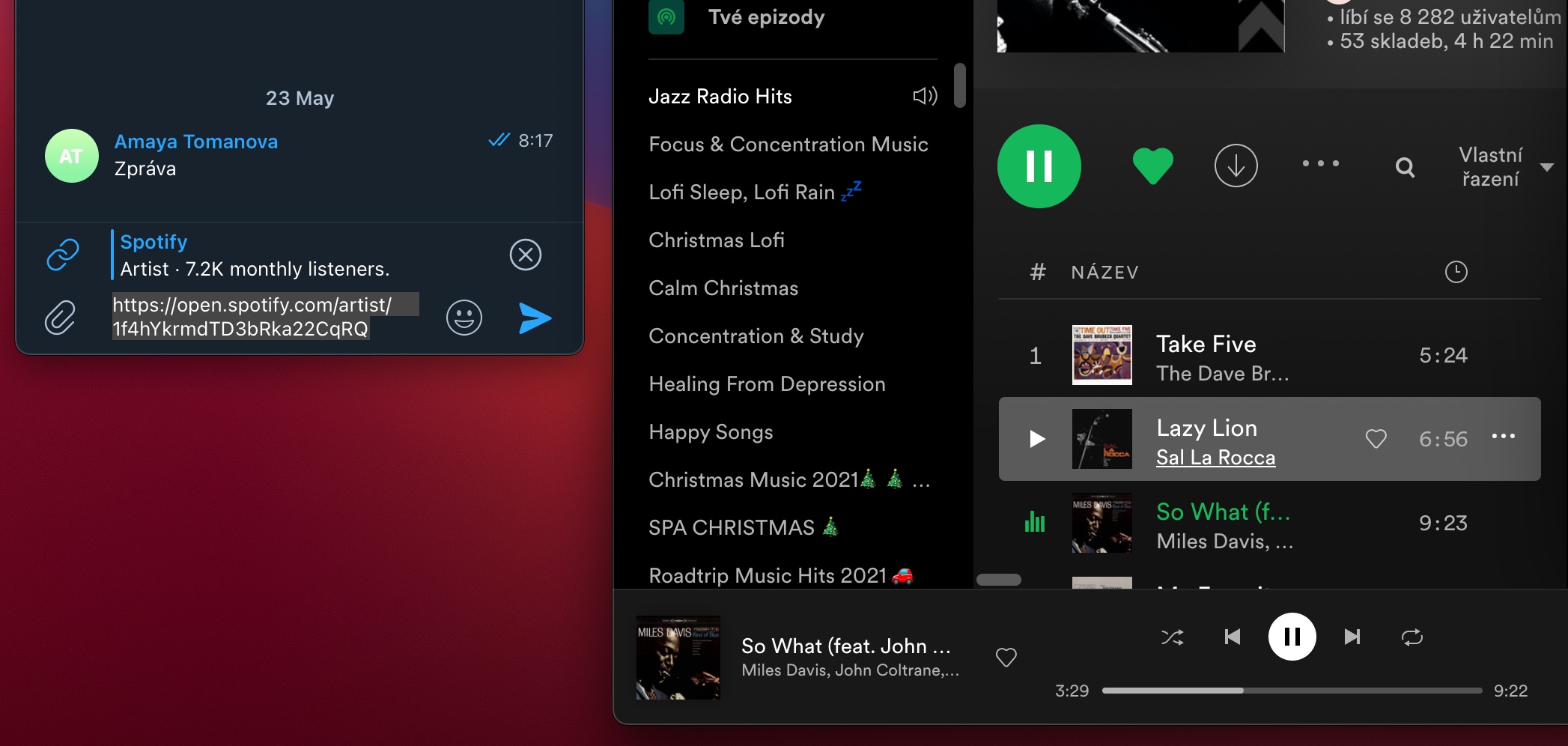 Způsobů, jak sdílet skladby ze Spotify, je více. Většina uživatelů se v případě sdílení skladeb z desktopové aplikace Spotify uchyluje ke kliknutí na tři tečky vedle názvu skladby a poté na tlačíko Sdílet. Existuje ale rychlejší a snazší možnost, a to jednoduše vybrat skladbu a stylem Drag & Drop ji přetáhnout do Messengeru, Telegramu, WhatsAppu nebo na jakékoliv jiné místo, odkud ji chcete sdílet.