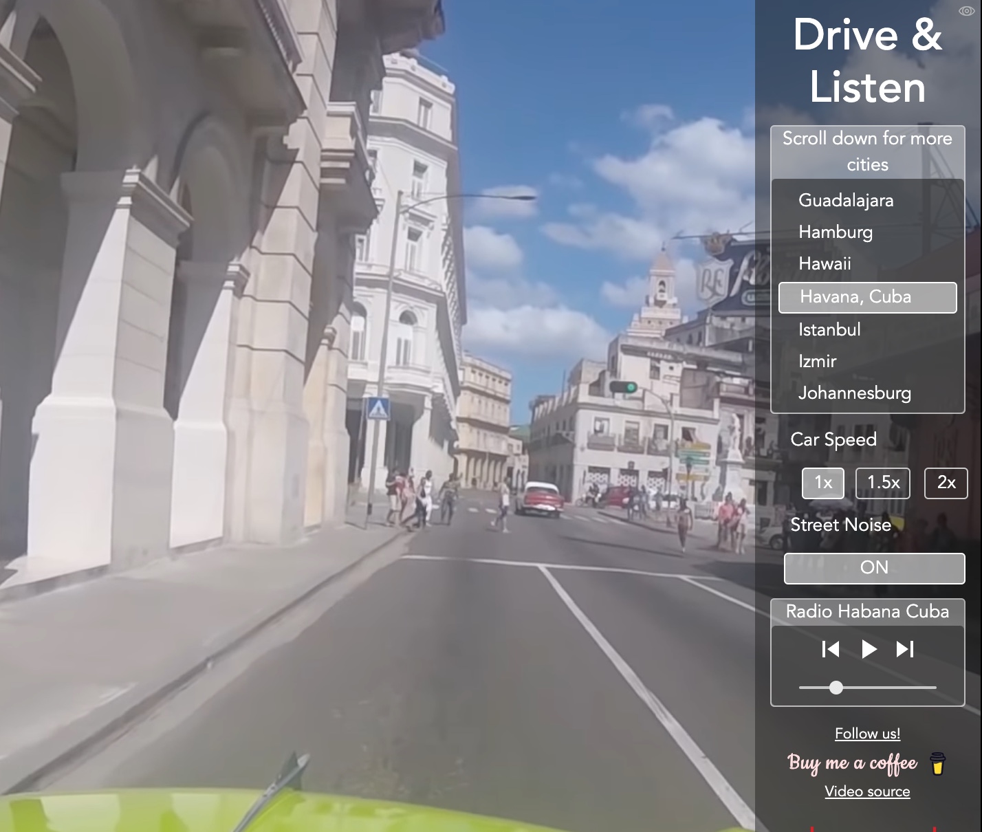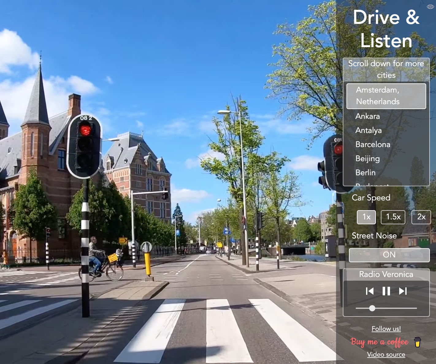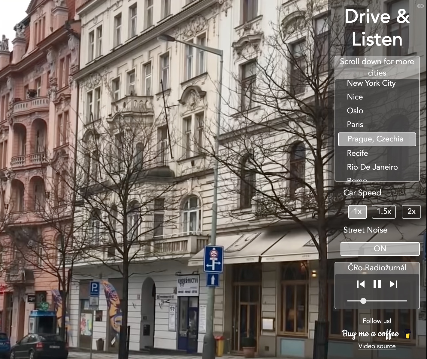Stýská se vám po cestování? Často si přestavujete, že jen tak projíždíte v autě některým ze světových měst a posloucháte u toho hudbu? Pokud zrovna z jakýchkoliv důvodů nemůžete cestovat, můžete si atmosféru projíždění městem za poslechu hudby navodit na webu Drive & Listen, kde si jednoduše můžete vybrat jakékoliv město, pustit rádiovou stanici, která je v daném městě k dispozici, a relaxovat.