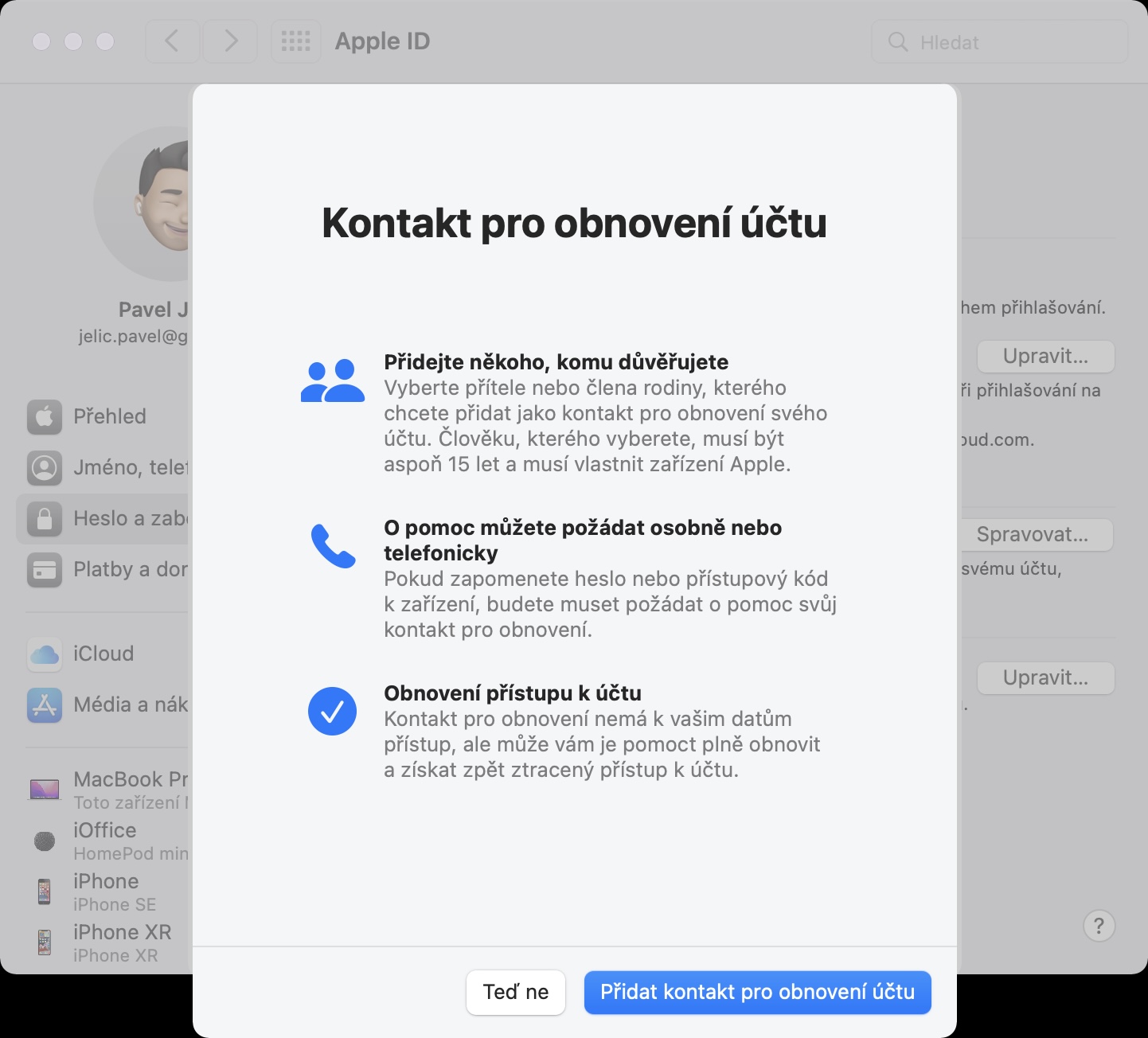 Tato funkce není přímo součástí předplatného iCloud+, souvisí ale s Apple ID a je k dispozici pro všechny uživatele. V případě, že se řadíte mezi jedince, pro které není problém sem tam něco zapomenout, tak dost možná máte strach z toho, že přijdete o přístup k vašemu Apple ID. Nově si můžete ve vašem účtu nastavit speciální kontakty, které vám s obnovením vašeho účtu mohou pomoci. Pro přidání důvěryhodného kontaktu pro obnovení účtu stačí přejít do nastavení iCloudu, kde klepněte na sekci Heslo a zabezpečení. Následně v sekci Obnovení účtu stačí kontakty přidat.