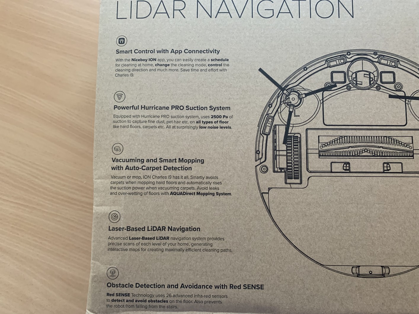 Než se pustíme do samotného popisu, podívejme se na technické specifikace. Jedná se o robotický vysavač se systémem AQUADirect mopování (dávkování vody), jenž lze ovládat za pomoci mobilní aplikace. Hodí se na všechny typy podlah, přičemž díky kartáči Animal Brush neuniknou vysavači ani zvířecí chlupy. Dále Niceboy iON Charles i9 disponuje LiDARem, vysokým sacím výkonem 2500 Pa se systémem Hurricane PRO, třístupňovým filtrovacím systémem s HEPA filtrem, podporou hlasových asistentů či prevencí nárazů do překážek a pádu ze schodů s technologií Red SENS. Rozměry tohoto robota jsou 346 x 340 x 99 milimetrů a hmotnost přibližně 3,1 kg. Dále se tento kousek může chlubit Wi-Fi, baterií o kapacitě 5000 mAh, výkonem 40W a objemem vodní a prachové nádrže o velikosti 450 mililitrů. Vysavač na vás bude i mluvit, a to česky, slovensky nebo anglicky. Jeho baterie zvládá úklid o délce až 120 minut. Hodí se tedy i na úklid většího prostoru. Dostane se i do těžko přístupných míst a překoná překážky o výšce až 1,5 centimetru.