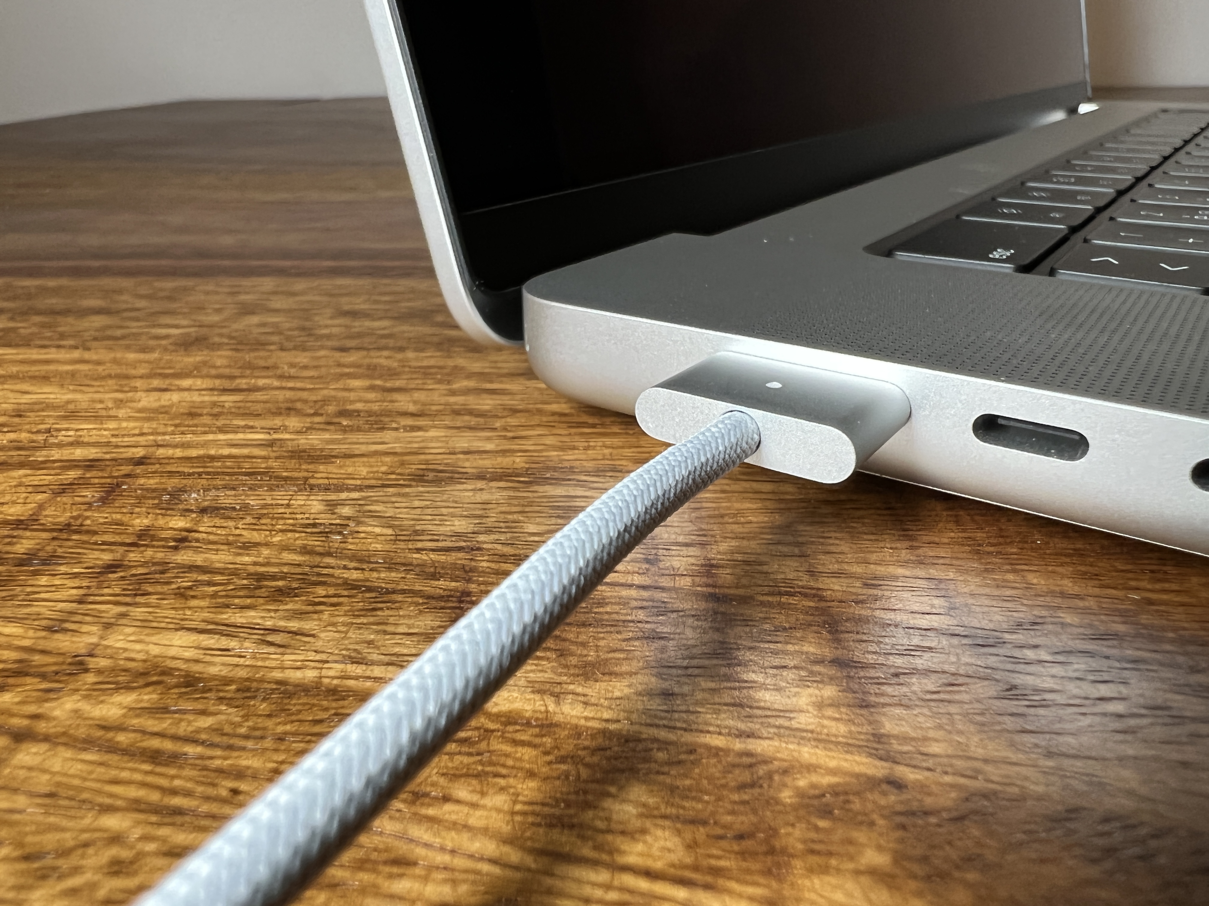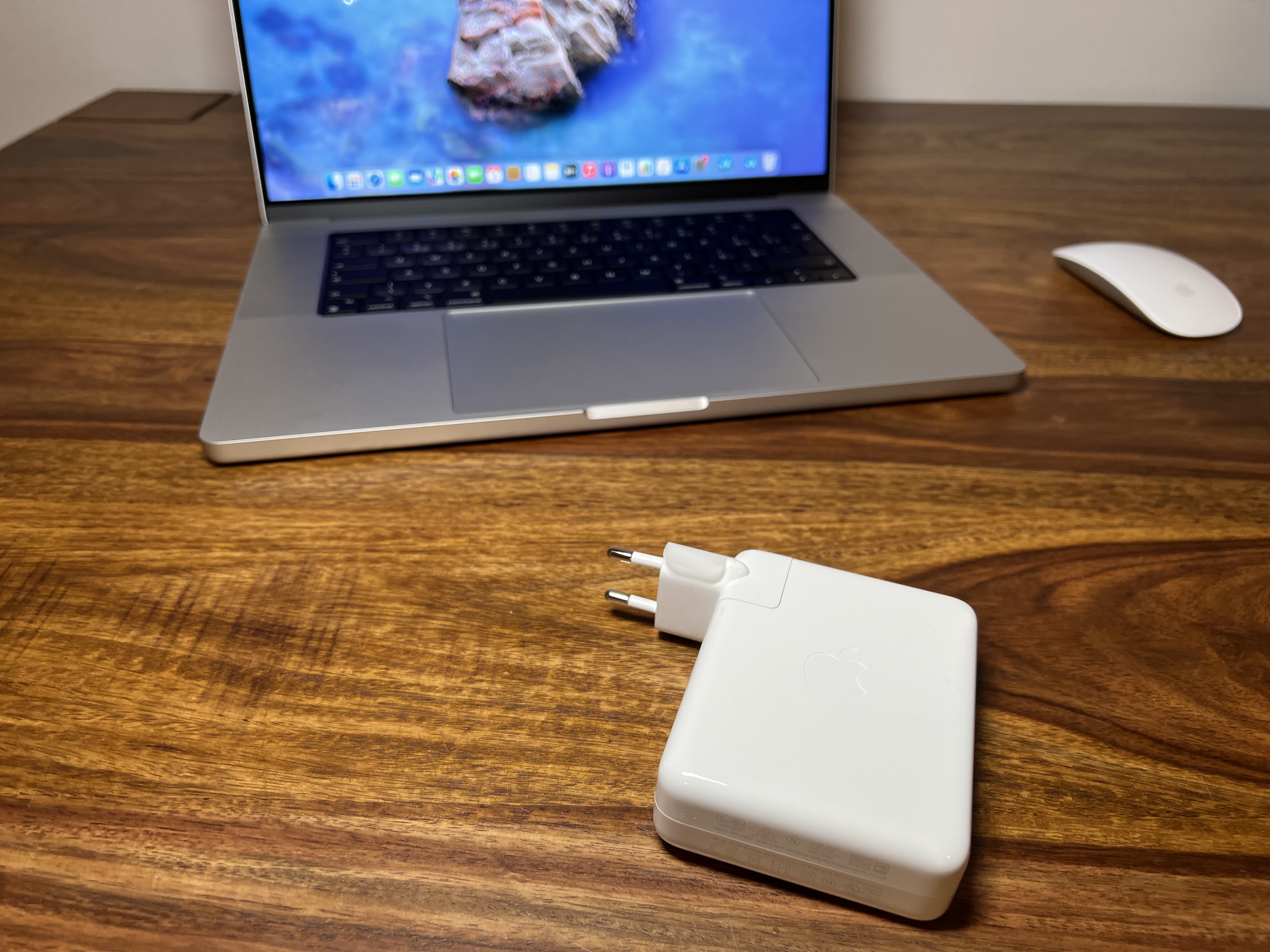 Nabíjení probíhá pomocí MagSafe konektoru, do kterého zapojíte buď 96W adaptér nebo jako v mém případě 140 W adaptér, který získáte k vybraným vyšším konfiguracím MacBooku Pro. Dejte si pozor, ne ke každému 14″ MacBooku je autoamticky přibalen 140 W adaptér. Já jsme měl tedy možnost vyzkoušet to nejrychlejší, co Apple aktuálně umí k MacBookům nabídnout. Prvních 50 % kapacity baterie nabijete za neuvěřitelných 30 minut, což je na tak velkou 100 Wh baterii, kterou počítač obsahuje, skutečně velmi dobrý čas. Následně probíhá nabíjení rychlostí 9 % za 10 minut, což vzhledem k tomu, že posledních 20 % probíhá nabíjení o něco pomaleji, znamená, že MacBook Pro M1 Pro nabijete za zhruba hodinu a půl.