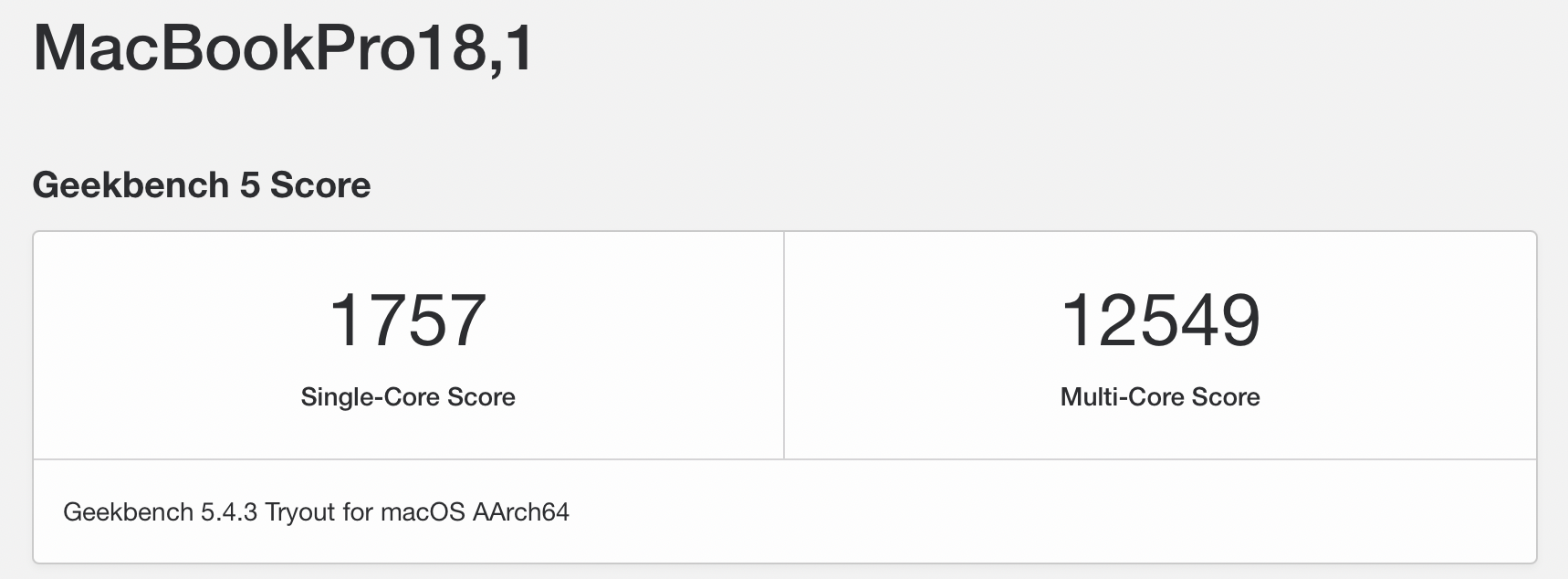 Ani základní varianta, kterou jsme testoval já, vás však nebude ničím omezovat. Nabízí totiž procesor M1 Pro s 10 jádrovým CPU a 16 jádrovým GPU s propustností paměti 200 Mb/s, 16GB operační paměti a 512 GB SSD. Právě tuto konfiguraci jsem také podrobil měření v rámci benchmarku GeekBench. Pro porovnání přináším také výsledky, které dosáhl můj domácí iMac iMac 27″ 5K, který jsem osadil následovně: 3,6GHz 10jádrový Intel Core i9 desáté generace, Radeon Pro 5700 XT s 16 GB paměti GDDR6 a 1TB SSD a 128GB RAM. Tento počítač dosahuje v GeekBench testu skóre 1182 bodů na jedno jádro a 9691 bodů na všechna jádra. Můj MacBook Air s procesorem M1 pak dosahuje skóre 1718 bodů na jedno jádro a 7531 bodů na všechna jádra. Zdá se vám to poměrně hodně, obzvlášť u MacBooku Air? Mě se to tak zdále dodnes také. Ovšem to, co jsem naměřil na MacBooku Pro, je tak trochu z jiného světa. Jedno jádro sice dosahuje jen 1757 bodů, ovšem při měření více jader se dostanete na výsledek 12 549 bodů, což je oproti klasickému M1 procesoru opravdu značný rozdíl.