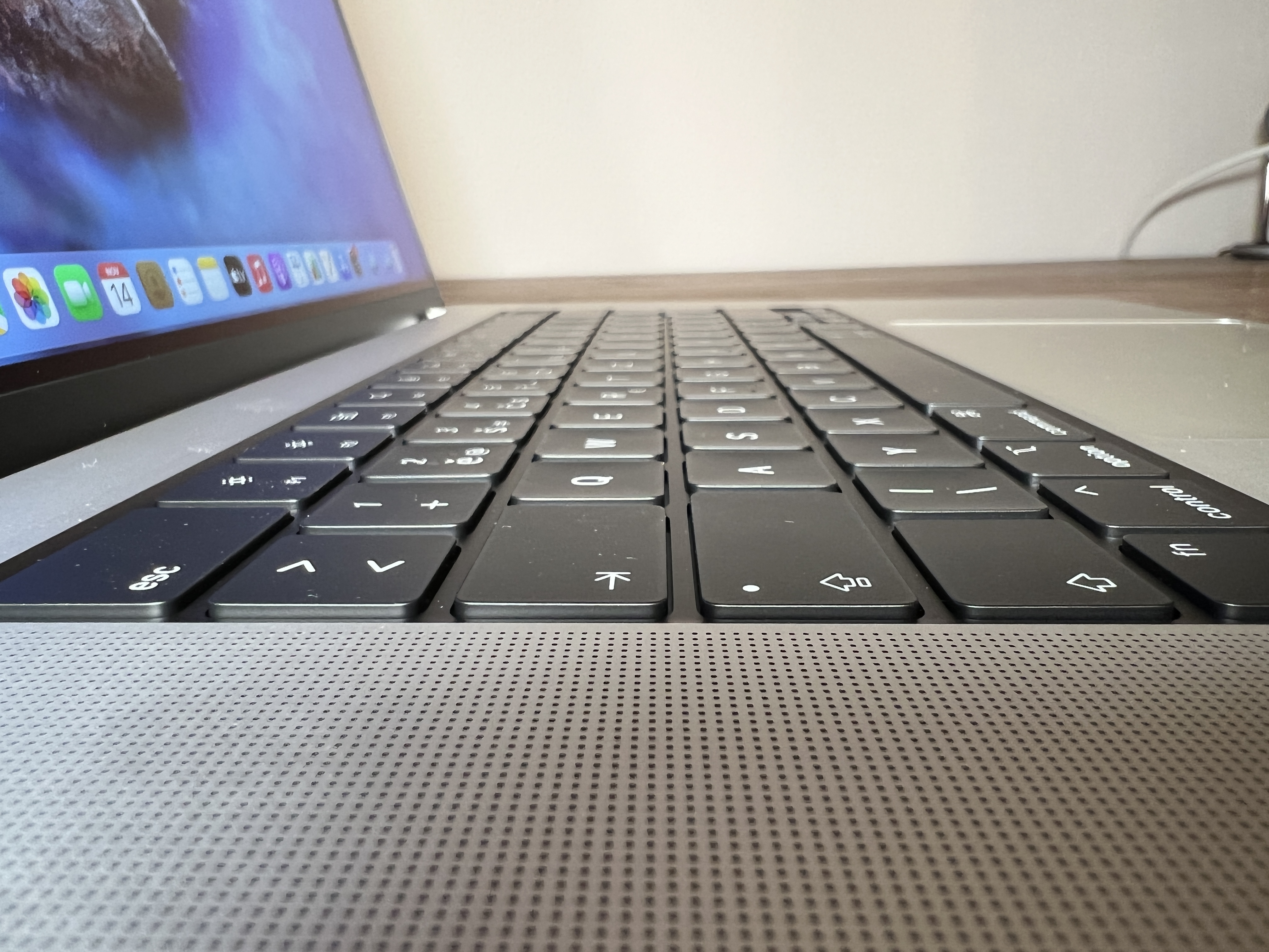 Jakmile otevřete víko počítače, uvidíte kromě XDR displeje, ke kterému se ještě dostaneme i s jeho pověstným výřezem také obrovský trackpad, který je snad tím největším, jaký jsem kdy v životě viděl. Ani po čtrnácti dnech testování jsem však nepřišel na to, jak jej využít naplno a jeho velikost mi přijde tak nějak zbytečná. Navíc díky ní je klávesnice umístěna blíž displeji, což mi osobně při psaní příliš nevyhovuje, ale chápu, že se jedná o věc zvyku a vkusu. Jestli však někdo umí skutečně na 100 % využít velikost trackpadu, který Apple nabízí v tomto stroji, budu rád, když mi do komentářů napíšete, jak a k čemu. Jestli je něco, co nepůsobí na tomto stroji tím nejprémiovějším dojmem, pak je to klávesnice. Ta je celá zapuštěna v černém plastu, který je vsazen do těla MacBooku a působí dojmem, jako by vystupovala nad tělo počítače. Jedná se však jen o dojem a samozřejmě když zavřete víko, klávesnice se jej nedotýká. Co se psaní týká, je to stará dobrá klávesnice, kterou Apple používá dlouhé roky. Není ničím lepší ani horší než u vašeho MacBooku Air.