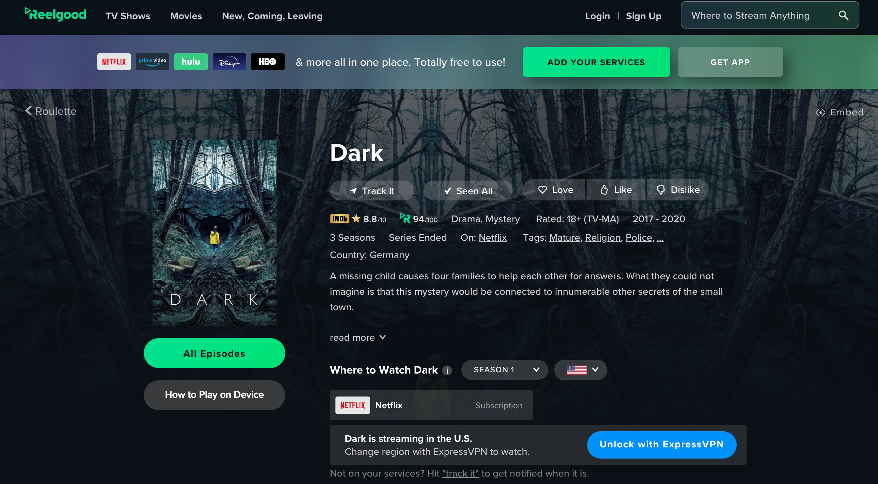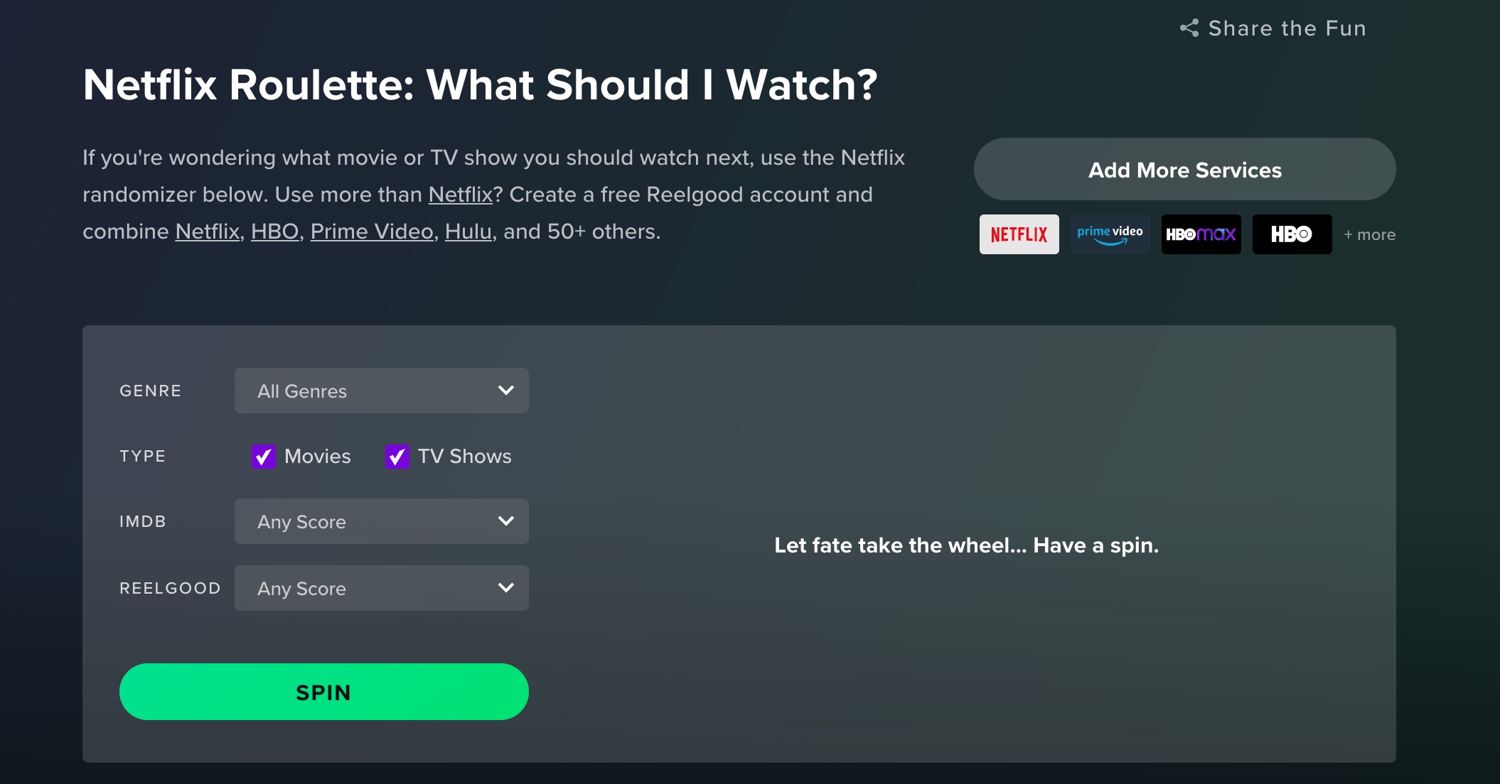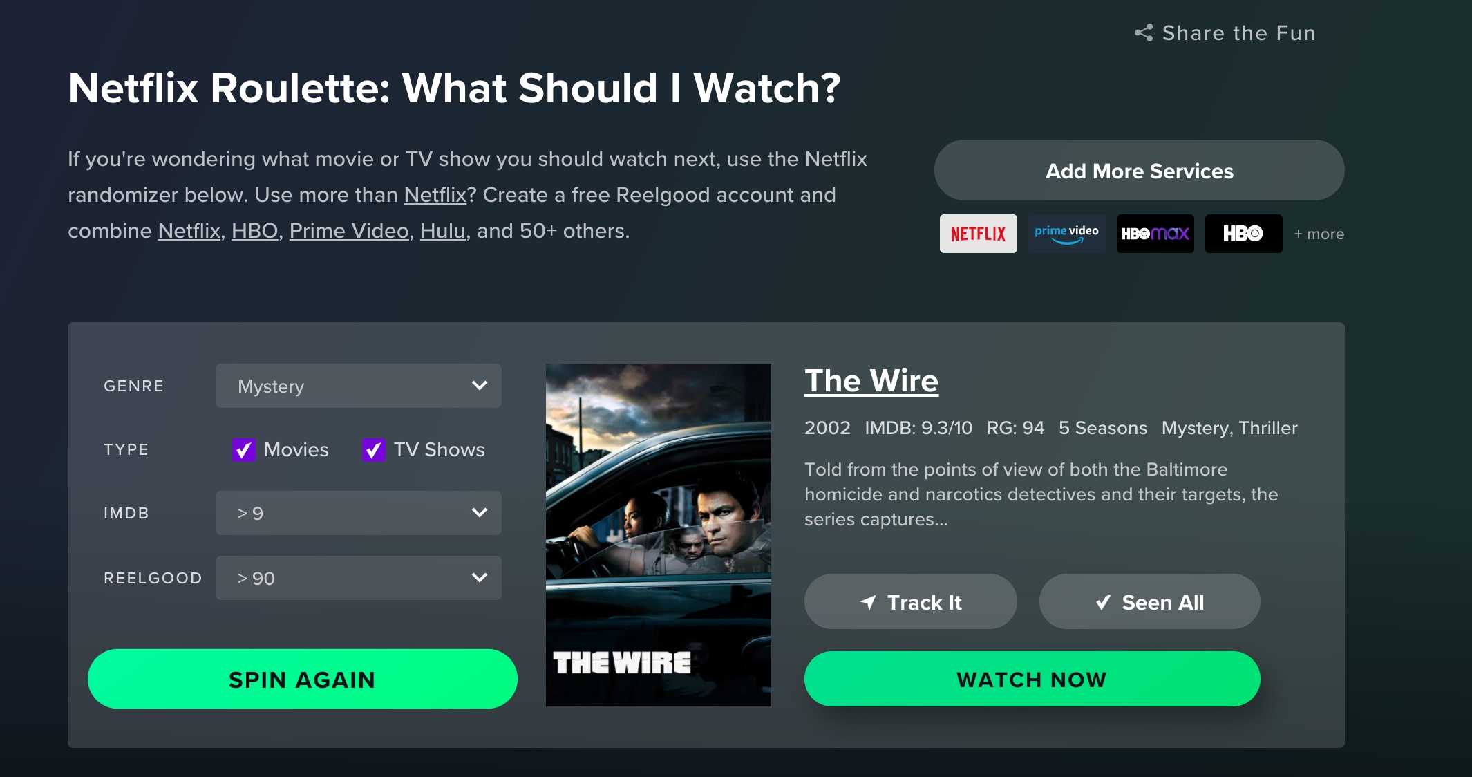 Nejrůznější stránky, které vám pomohou s výběrem toho pravého filmu či seriálu ke sledování, vám v našem pravidelném výběru nabízíme poměrně často. Dnes se bude jednat o Reelgood, aneb „Netflixovou ruletu“. Tento web vám na základě vámi zadaných parametrů vygeneruje film nebo seriál, na který se můžete podívat. Jednotlivé tituly zde ale můžete procházet také manuálně.