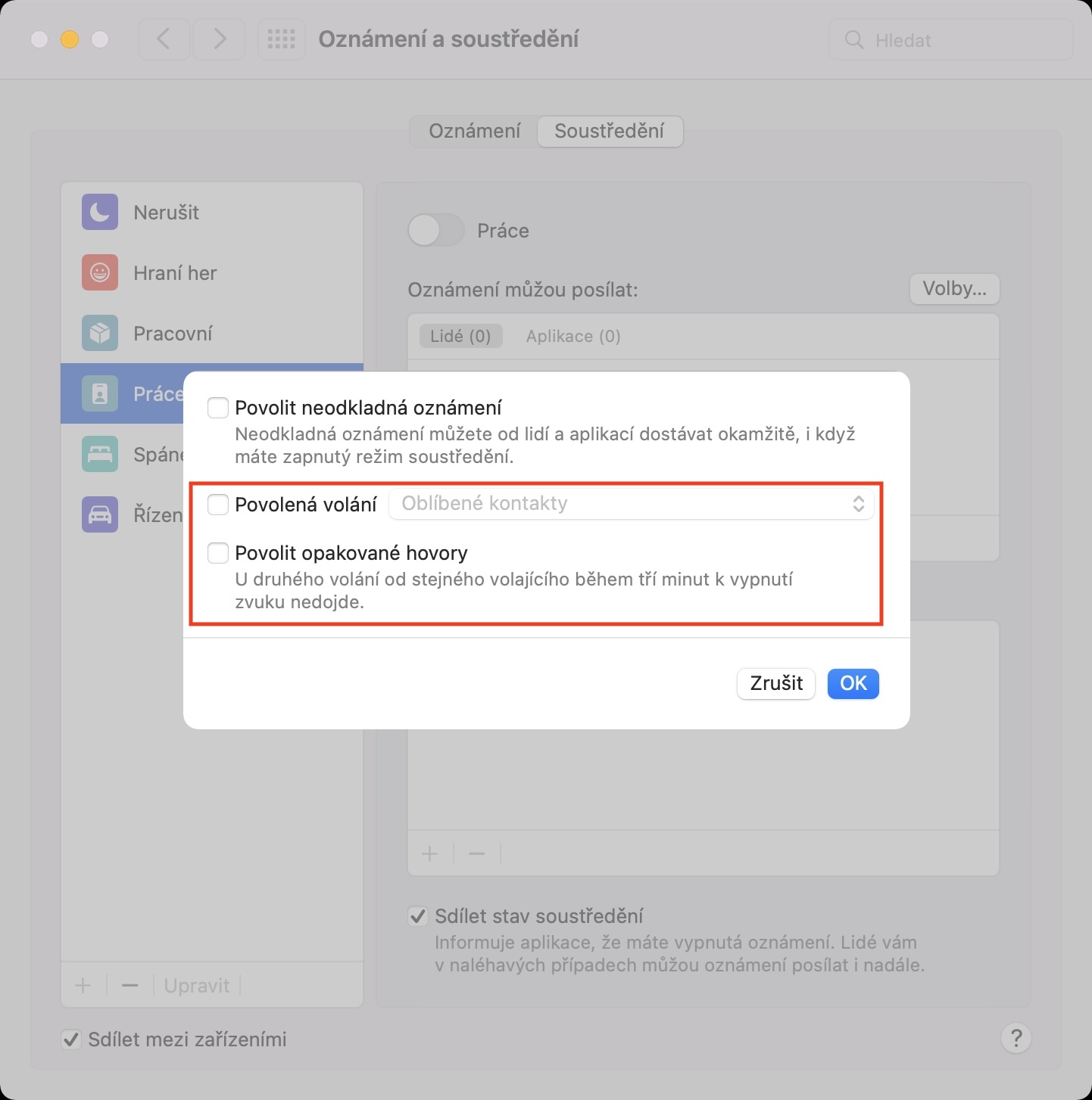 Nové režimy Soustředění kompletně nahradily původní režim Nerušit. Oproti tomu nabízí Soustředění o mnoho více nových funkcí, které rozhodně stojí za to. Pravdou ale je, že alespoň nějaké maličkosti si Soustředění z původního Nerušit přebralo. Jedná se o možnost pro nastavení povolených volání a opakovaných hovorů. Tyto předvolby se mohou hodit mnohým uživatelům, tudíž je rozhodně dobře, že je Apple do Soustředění v jablečných zařízeních přidal. Na Macu můžete nastavit povolená volání či opakované hovory následovně: