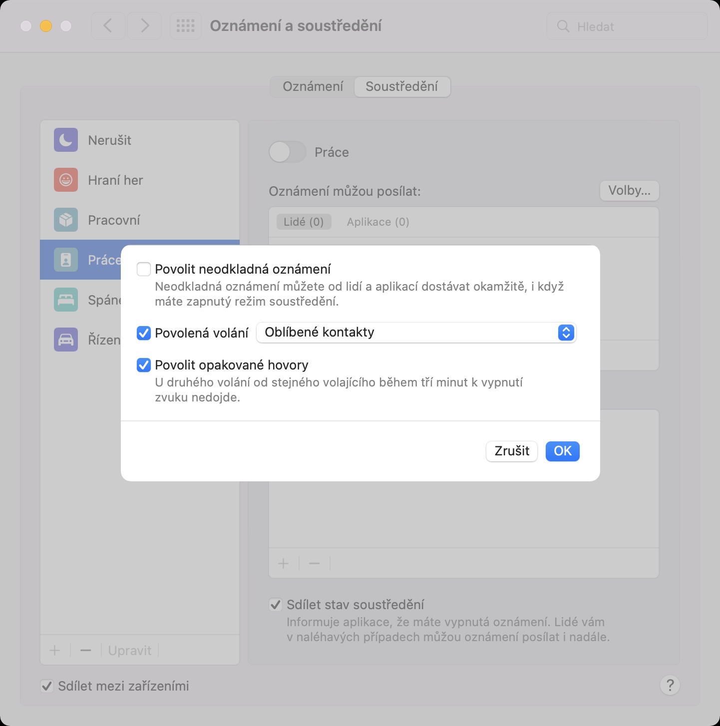 Využitím výše uvedeného postupu můžete na vašem Macu v rámci Soustředění jednoduše aktivovat povolená volání či opakované hovory. U povolených volání si můžete všeobecně vybrat, které kontakty se vám budou moci dovolat – k dispozici jsou Všichni, Všechny kontakty a Oblíbené kontakty. Jednotlivé kontakty lze samozřejmě i nadále nastavit individuálně v nastavení režimu. Pokud povolíte opakované hovory, tak u druhého volání od stejného volajícího během tří minut nedojde k vypnutí zvuku, tedy že i skrze aktivní režim tento hovor uslyšíte. Dobrou zprávou je, že se Soustředění synchronizuje napříč všemi vašimi Apple zařízeními, tudíž pokud třeba na Macu provedete nějaké úpravy režimu, tak se automaticky aplikují i na iPhonu, iPadu či Apple Watch – a všemožně navzájem.