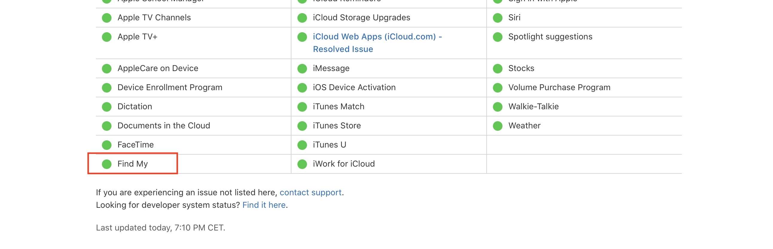 I když se to nestává příliš často, tak věřte, že problém nutně nemusí být na vaší straně. Stejně jako prakticky jakákoliv jiná služba nejen od Applu může mít Najít prostě výpadek. Jak už jsem zmínil, tak tyto výpadky jsou opravdu ojedinělé, rozhodně ale ne vyloučené. Pokud byste chtěli zjistit, zdali má služba Najít výpadek, tak se stačí přesunout na stránky Apple System Status. Zde se zobrazí stav všech služeb od Applu. Pokud služba funguje v pořádku, tak je u ní zelená barva, pokud je omezená, tak má barvu oranžovou. Funkce Najít je v tomto seznamu pod anglickým názvem Find my. Jestliže je tato funkce omezená, tak víte, že problém není na vaší straně.