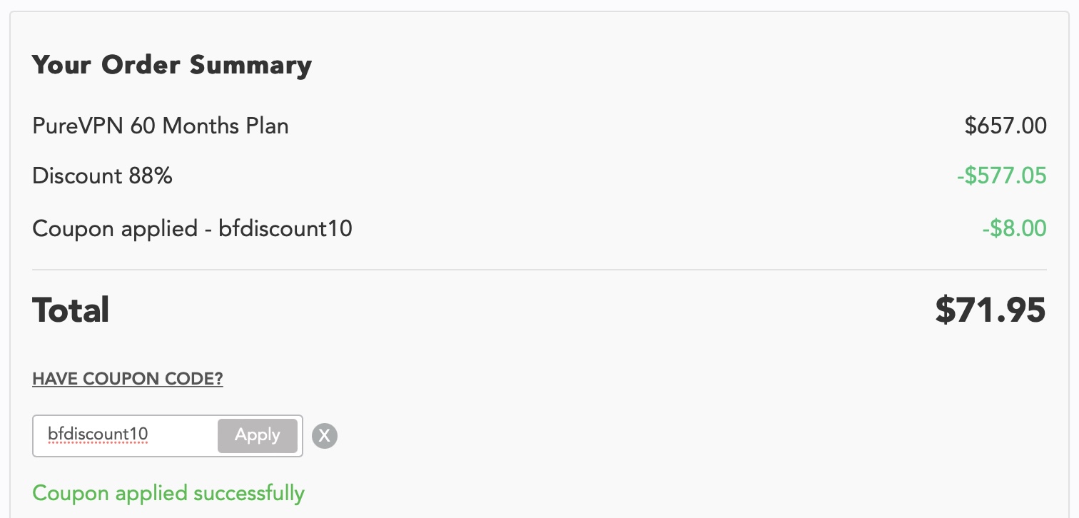 Jak už jsem nakousl výše, tak PureVPN si nyní můžete pořídit s více než 88% slevou. Onu slevu 88 % nabízí samotné PureVPN v rámci akce Black Friday, díky naší spolupráci s touto službou můžete získat ještě další 10% slevu navíc. Tato sleva je opravdu obrovská a opakuje se maximálně jednou do roka, a proto rozhodně s koupí neváhejte. Nabídka je totiž samozřejmě časově omezená a zbývá už jen několik málo hodin. Díky akci a naší slevě je nejvýhodnější pětileté předplatné, které bez slevy vychází na 657 dolarů. Po 88% slevě, kterou nabízí samotné PureVPN, se rázem dostanete na pouhých 79.95 dolarů, což je sleva celých 577.05 dolarů. Pokud navíc k tomu využijete ještě náš 10% slevový kód, tak na dva roky získáte PureVPN za pouhých 71.95 dolarů (1.20 dolarů měsíčně), což je v přepočtu zhruba 1635 korun (27 korun měsíčně). K dispozici jsou pak ještě také další předplatná ve slevě, a to tříměsíční a roční. Pokud byste chtěli využít tříměsíční předplatné, tak to vás po 39% slevě vyjde na celkově 19.95 dolarů (6.65 dolarů měsíčně), roční předplatné pak vychází na celkově 35.88 dolarů (2.99 dolarů měsíčně).