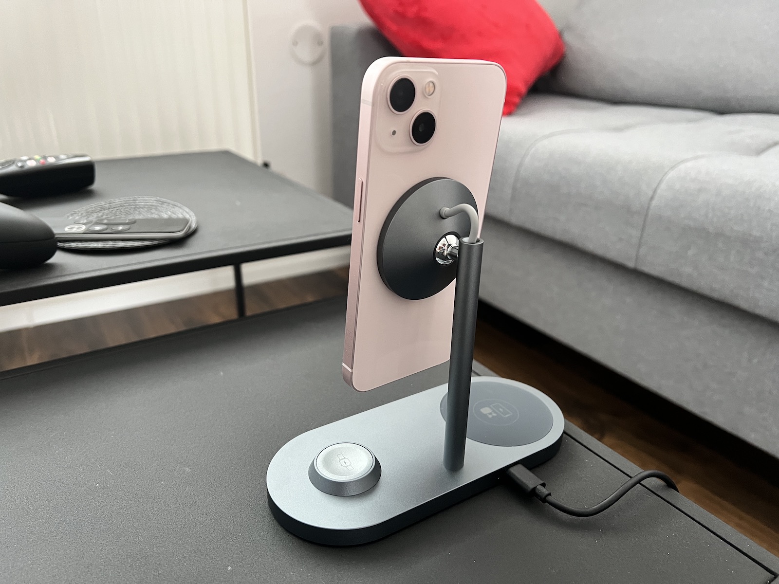 Nejzajímavější je dle mého MagSafe místo pro iPhony 12 (Pro) a 13 (Pro). Líbí se mi, že je magnetický puk připínatelný na záda telefonu díky kloubu na zádech naklopitelný a díky tomu si tak můžete příjemně upravit sklon vašeho telefonu například při videohovorech a tak podobně. Jen je trochu škoda, že magnetickou plošku spojuje s “tyčkou”, která ji drží, viditelný kabel, což není úplně estetické a myslím, že kdyby vedl přímo kloubem, jednalo by se o daleko lepší řešení. Na druhou stranu ale člověk napájecí kabel puku zepředu nevidí, takže s ním ve výsledku moc do styku nepřijde.