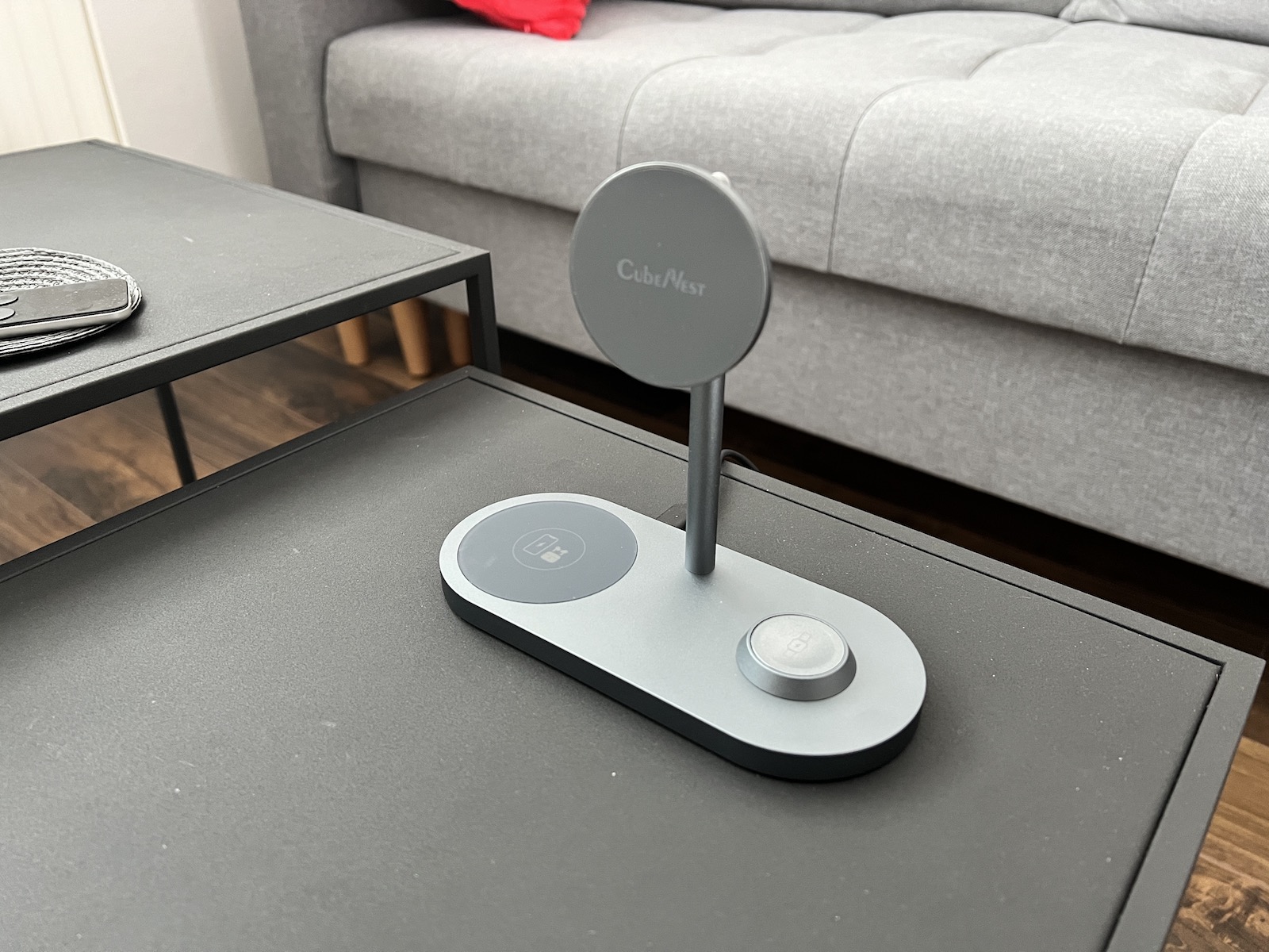 Nabíječka jako taková je vyrobena z kovu (pravděpodobně jde o hliník), jehož odstín je velmi blízký vesmírně šedé od Applu. Vzhledem k použitému materiálu vás tak asi nepřekvapí, že je relativně těžká a díky široké základně taktéž stabilní. O stabilitu se pak starají i gumové protiskluzové nožky na její spodní straně. Co se pak týče nabíjecích plošek, k dispozici je konkrétně magnetická kolébka pro Apple Watch, MagSafe nabíjení na “tyčce” a klasické Qi nabíjení v základně nabíječky, které lze využít jak k nabíjení druhého smartphonu, tak třeba pro nabíjení AirPods.
