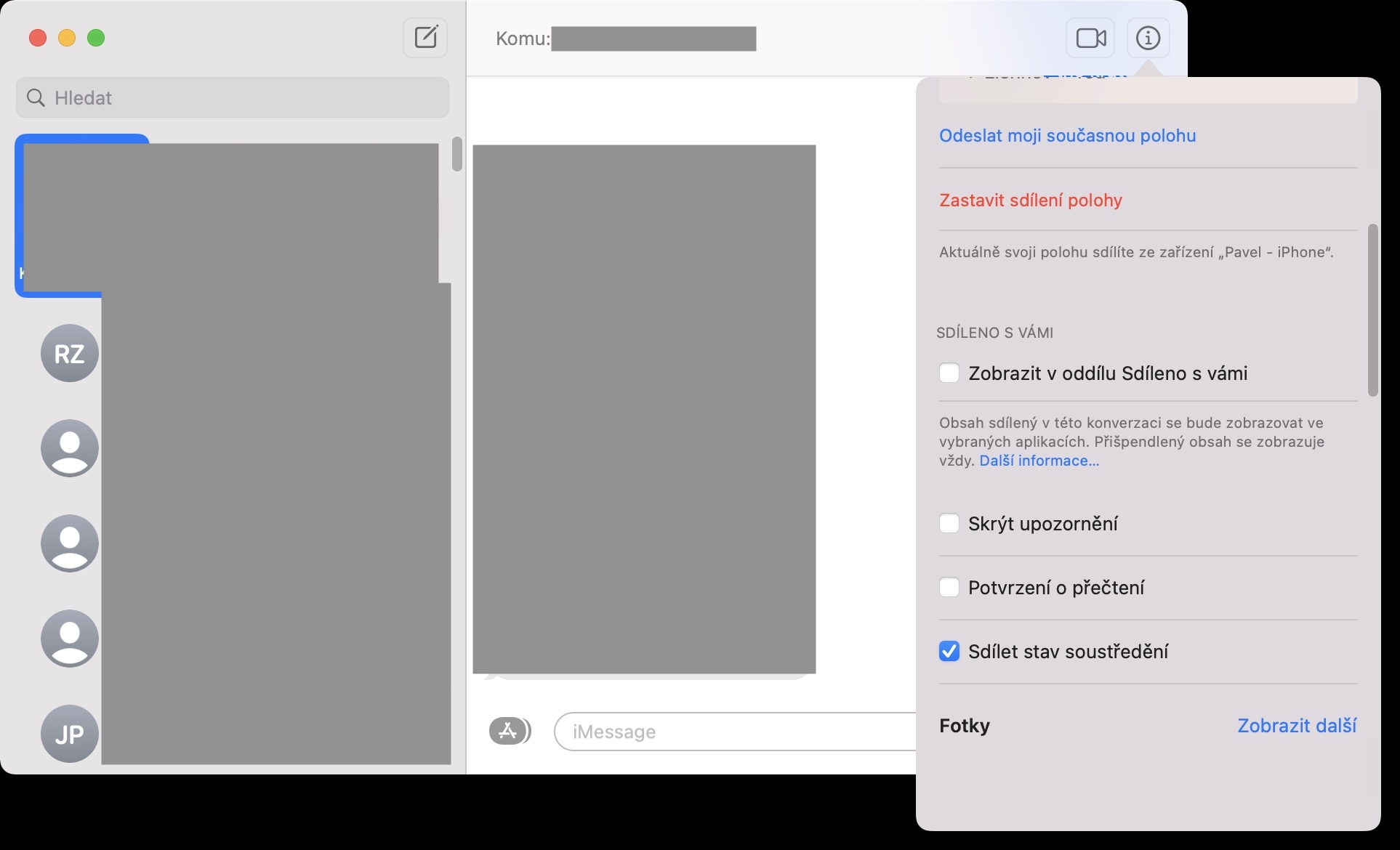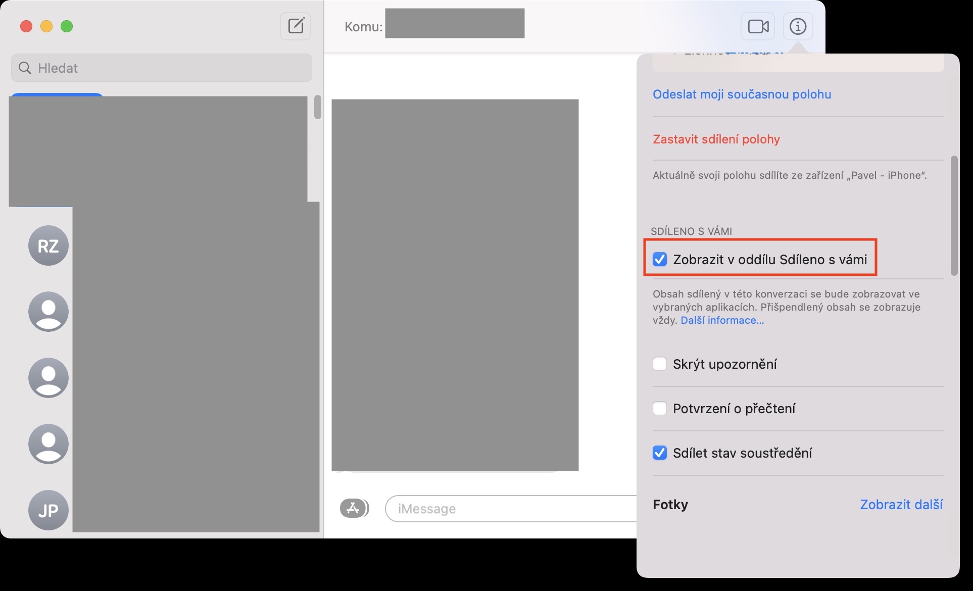 V případě, že vám někdo odešle nějaký obsah vyjma textu, tedy například obrázek, odkaz, podcast apod., tak se vám tento obsah zobrazí v oddílu Sdíleno s vámi v příslušné aplikaci. Co si ale budeme nalhávat, prakticky každý z nás má nějakého kamaráda, se kterým si posíláme určitý obsah, jenž nechceme mimo konverzaci zobrazit. I na tohle Apple naštěstí myslel a v rámci Sdíleno s vámi přišel s možností pro vypnutí této funkce u vybraného kontaktu. Pokud chcete provést deaktivaci Sdíleno s vámi u kontaktu, tak přejděte do Zpráv, kde si otevřete vybranou konverzaci. Poté v pravé horní části klepněte na ikonu ⓘ, čímž se zobrazí malé okno, ve kterém níže deaktivujte možnost Zobrazit v oddílu Sdíleno s vámi.