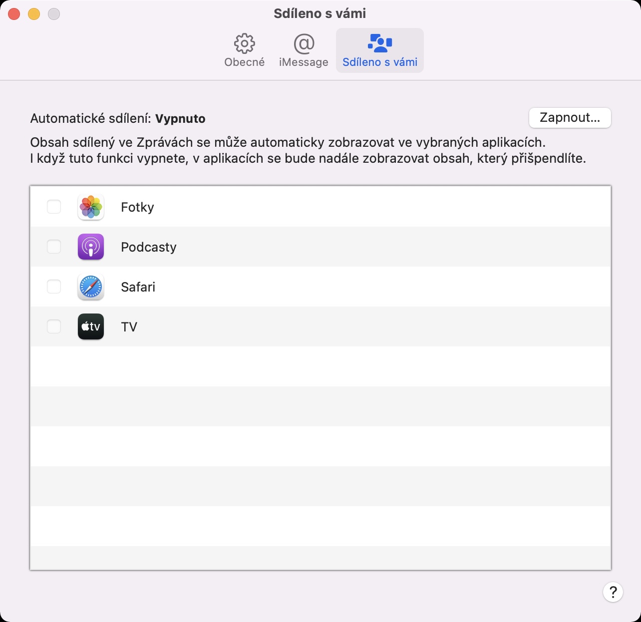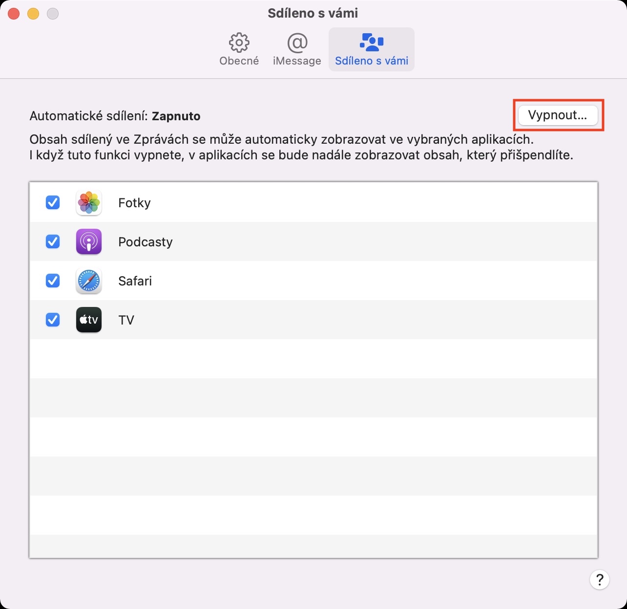 Již jsme se společně podívali na to, jak lze Sdíleno s vámi deaktivovat u kontaktu, popřípadě ve vybrané aplikaci. Pokud vám Sdíleno s vámi nevyhovuje vůbec a byli byste nejraději, kdyby vůbec neexistovalo, tak pro vás mám skvělou zprávu – můžete provést kompletní deaktivaci této funkce. V tomto případě stačí, abyste se přesunuli do nativní aplikace Zprávy, kde poté v levé části horní lišty klepněte na záložku Zprávy. Jakmile tak učiníte, tak z menu, které se zobrazí, vyberte možnost Předvolby… Tímto se otevře nové okno, ve kterém se v horní části obrazovky přesuňte do sekce Sdíleno s vámi. Následně stačí, abyste v pravé horní části okna klepnuli na Vypnout…