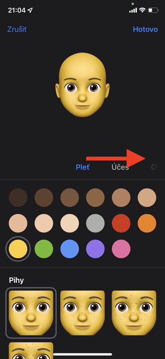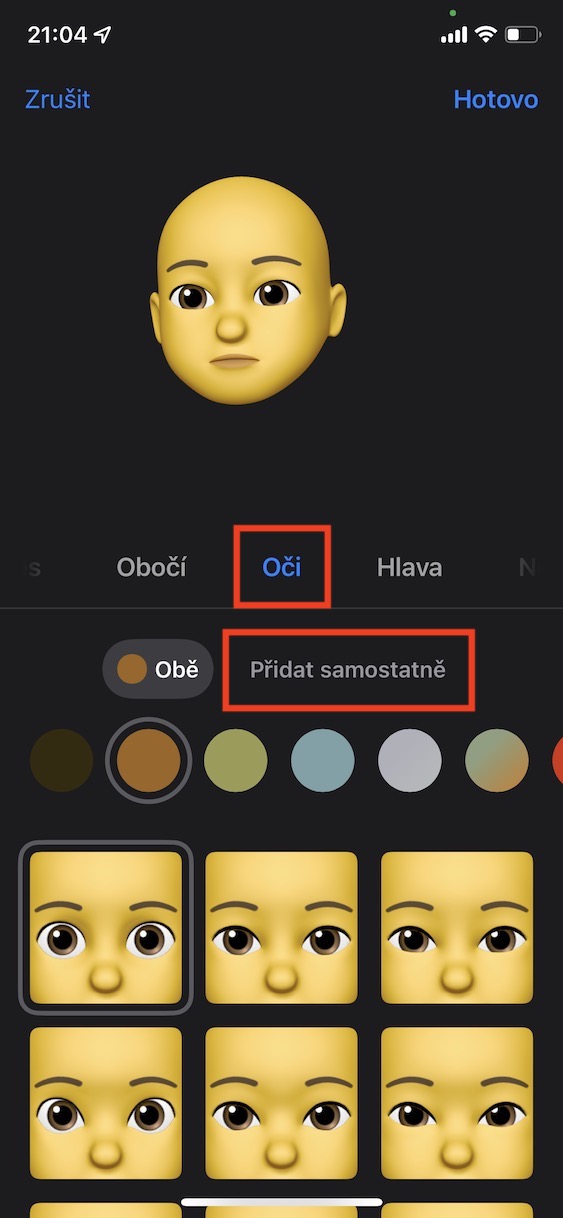 - Tímto se ocitnete v rozhraní pro upravení vašeho Memoji, kde se přesuňte do sekce Oči.