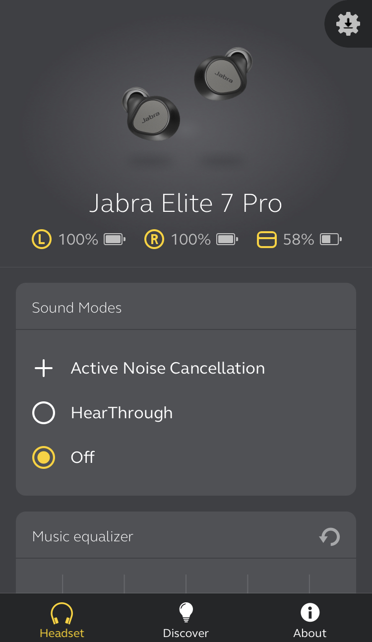 Jak je dnes již dobrým zvykem, alespoň tedy u dražších modelů sluchátek, i v tomto případě je možné se sluchátky manipulovat jak prostřednictvím fyzických tlačítek, tak v rámci doprovodné aplikace Jabra Sound+. Co se týče tlačítek jako takových, vzhledem k jejich omezeném počtu (2) nabídnou pouze základní ovládací prvky, jako je play, pause, skip, změnu hlasitosti či ovládání funkcí hovoru. Pomocí sluchátek se také aktivují poslechové režimy (základní, ANC, HearThrough), které se však dále konfigurují v doprovodné aplikaci.