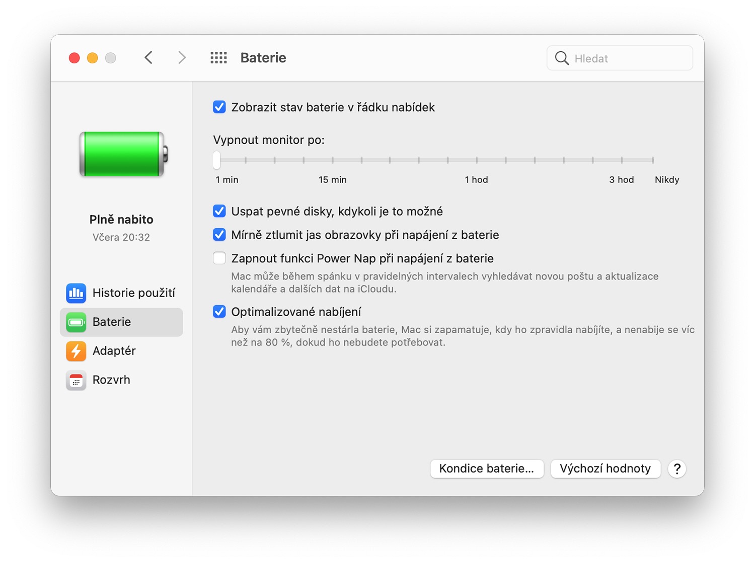 Apple se snaží uživatelům poskytnout nástroje pro prodloužení výdrže baterie. Do nastavení se dostanete po kliknutí na Předvolby systému a poté Baterie. Doporučujeme nastavit krátký čas u vypnutí monitoru, ztlumit jas při napájení z baterie a také zapnout funkci Optimalizované nabíjení. Díky ní si bude Mac pamatovat, kdy ho obvykle nabíjíte a baterie se nebude tak rychle opotřebovávat.