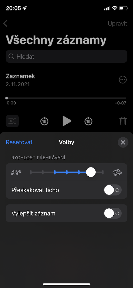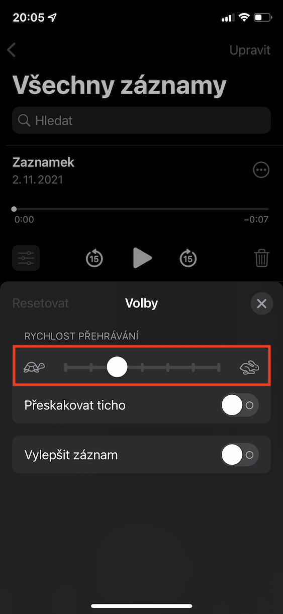 Pomocí výše uvedeného postupu je tedy možné na vašem iPhonu v aplikaci Diktafon zrychlit či zpomalit přehrávání záznamu. Jakmile rychlost pomocí posuvníku změníte, tak se modrou barvou zvýrazní, jak moc došlo ke změně rychlosti přehrávání. Jednoduše tak můžete v případě potřeby opět nastavit původní rychlost přehrávání záznamu. Kromě změny rychlosti přehrávání můžete ve stejné sekci také aktivovat funkci pro přeskočení ticha, popřípadě pro vylepšení záznamu, což se rozhodně může hodit.
