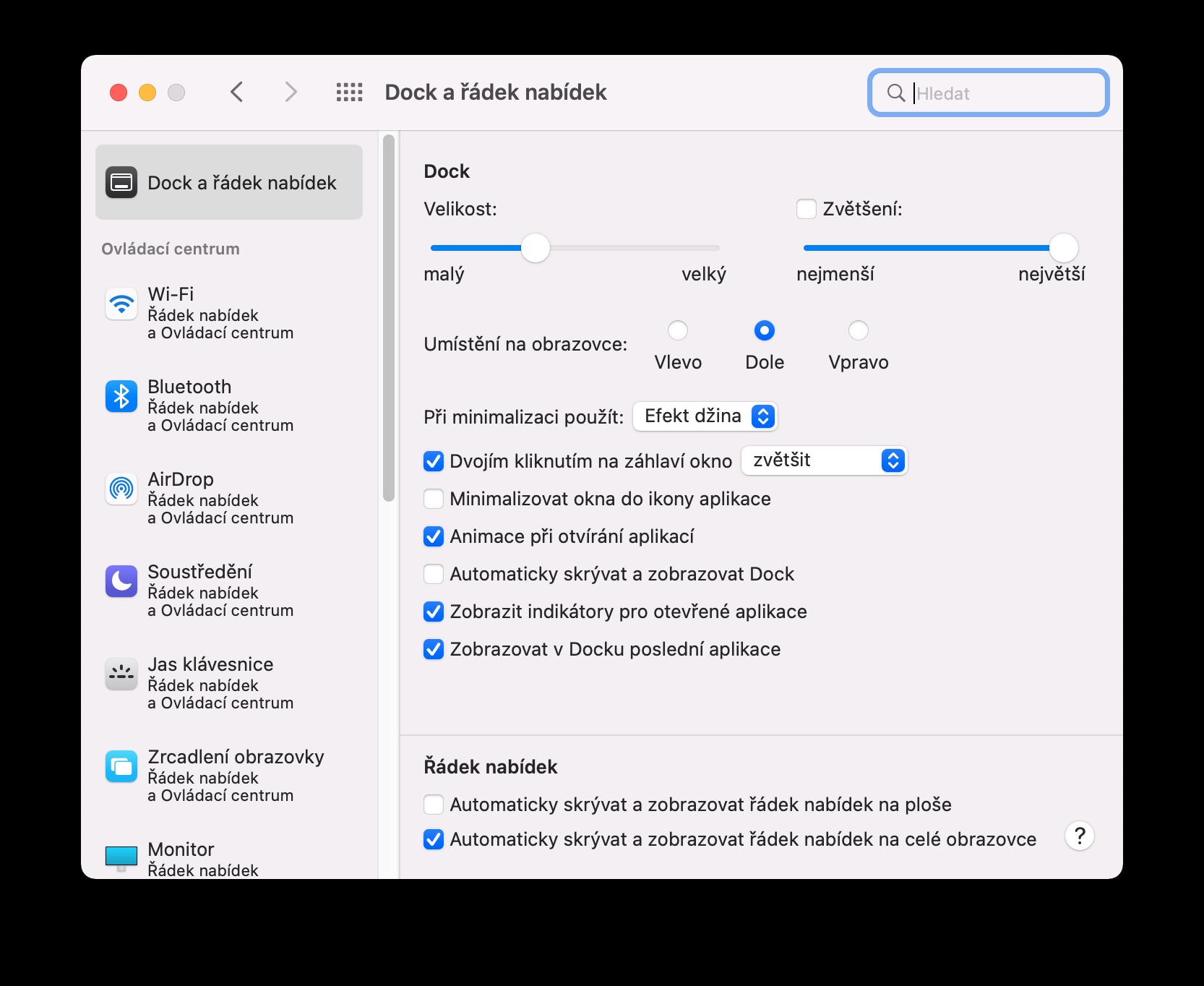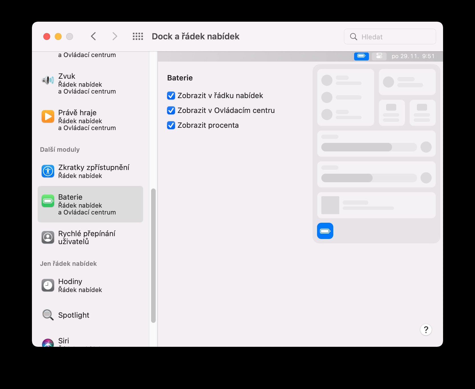 O tom, které prvky chcete mít v Ovládacím centru na vašem Macu, můžete rozhodnout vy sami. Pro přizpůsobení obsahu Ovládacího centra klikněte v levém horním rohu obrazovky vašeho Macu na Apple menu -> Předvolby systému. V okně předvoleb zvolte položku Dock a řádek nabídek, a poté v panelu na levé straně vyberte v sekci Další moduly jednotlivé prvky, které chcete přidat do Ovládacího centra.
