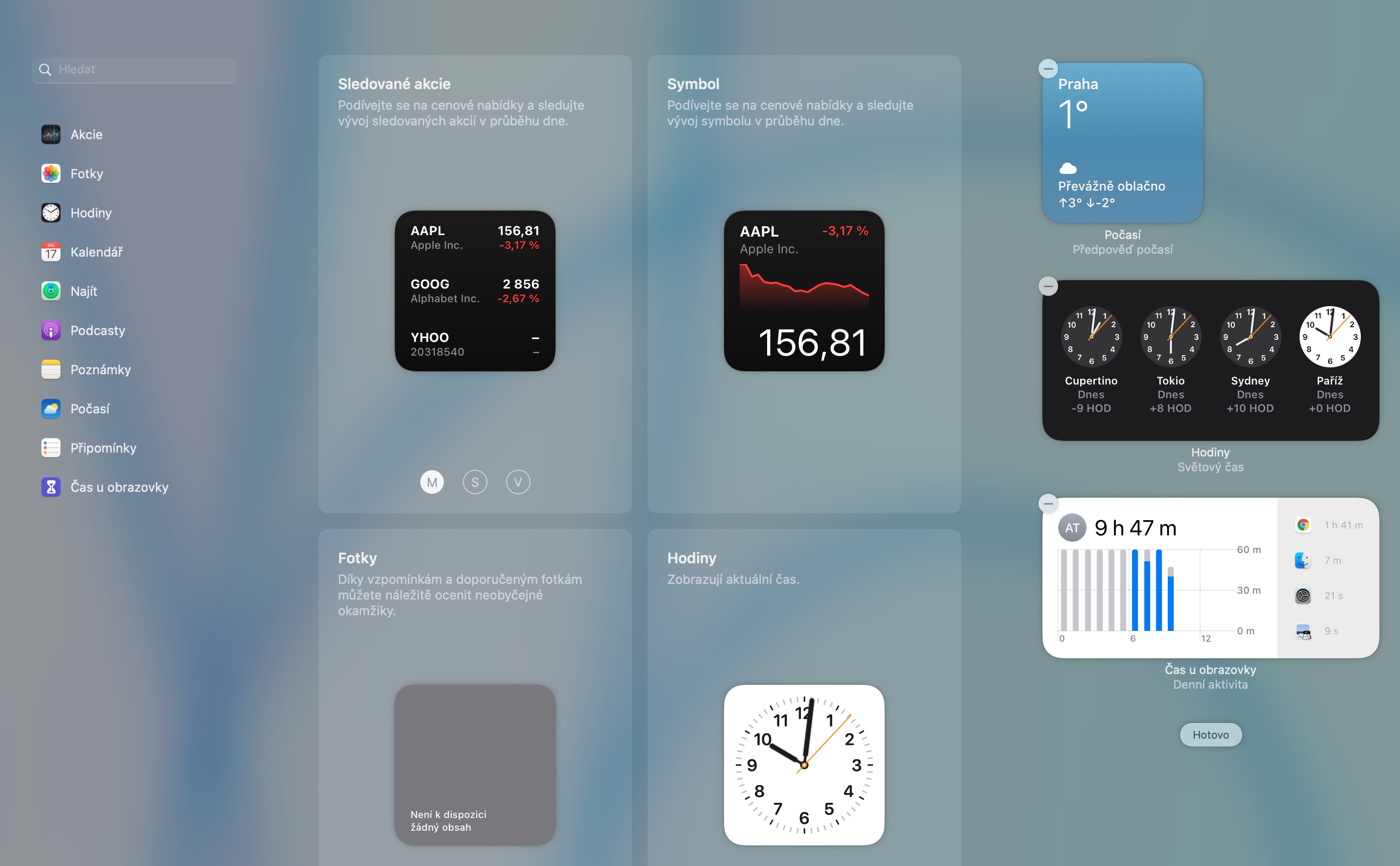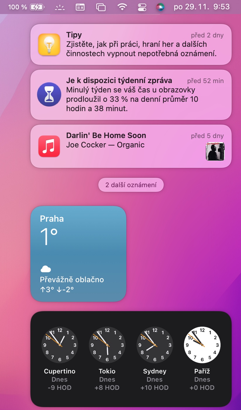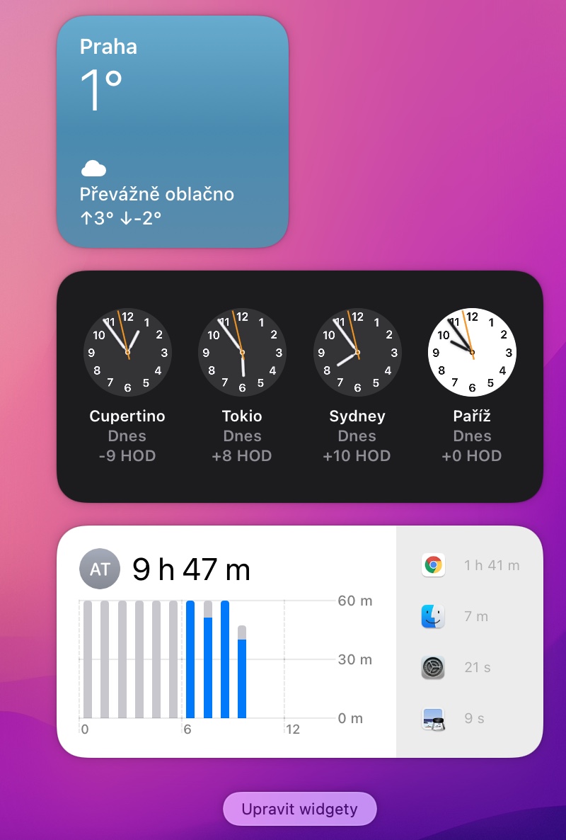 Když v pravém horním rohu obrazovky vašeho Macu kliknete na údaj o čase, zobrazí se vám Oznamovací centrum. Zde kromě notifikací najdete také užitečné a informativní widgety. Obsah Oznamovacího centra můžete na vašem Macu velice snadno upravit a přizpůsobit. Nejprve kliknutím na údaj o čase aktivujte Oznamovací centrum. Nyní podobně zamiřte v Oznamovacím centru o něco níže, kde kliknete na Upravid widgety, a poté stačí už jen začít upravovat, přidávat a případně odstrańovat jednotlivé widgety.
