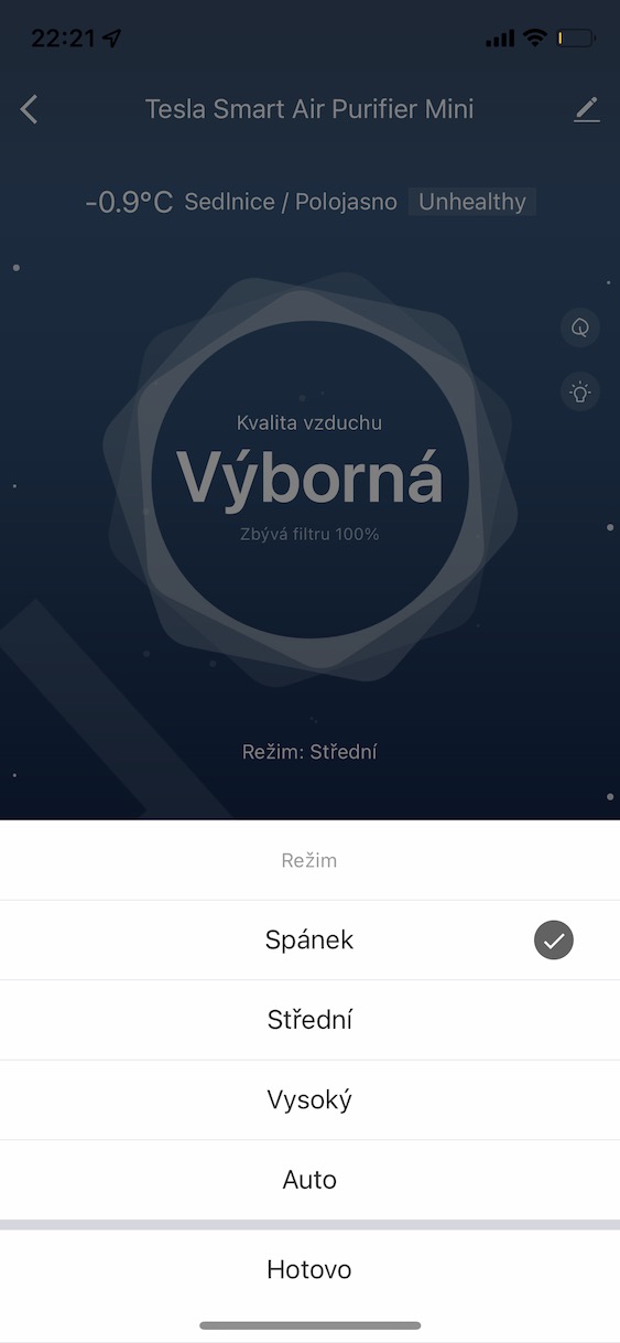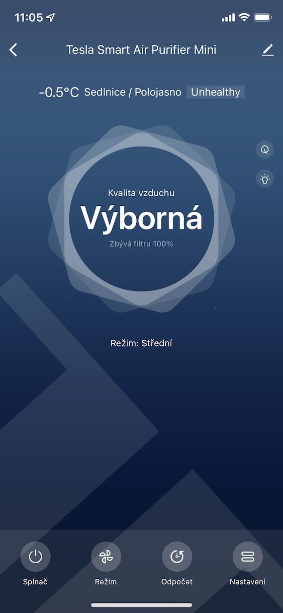 Po stránce designu nelze taktéž vytknout prakticky nic. Čistička vzduchu by měla naprosto parádně zapadnout do vaší domácnosti, podobně jako třeba lednička, televize či jakýkoliv jiný spotřebič. Pořád se totiž jedná o součást domácnosti a svým způsobem také jakýsi designový prvek. Tesla Smart Air Purifier Mini má po celém těle bílou barvu s tím, že v horní části najdete malé logo společnosti Tesla, zhruba uprostřed pak stylový chromovaný proužek. Ve spodní polovině se nachází dírkování pro nasávání špinavého vzduchu, který je následně „prohnán“ filtrem. Vyčištěný vzduch jde následně přes výdech umístěný nahoře. Uprostřed této mřížky se pak nachází ovládací panel s několika tlačítky, pomocí kterého je možné čističku manuálně zapnout, a poté nastavit například rychlost, ionizaci, časovač a noční režim. Primárně je tato čistička vzduchu ale chytrá z toho důvodu, jelikož ji můžete jednoduše ovládat pomocí vašeho iPhonu. Samozřejmě to jde i bez něj, ale to byste už chytrou čističku jednoduše nepotřebovali.