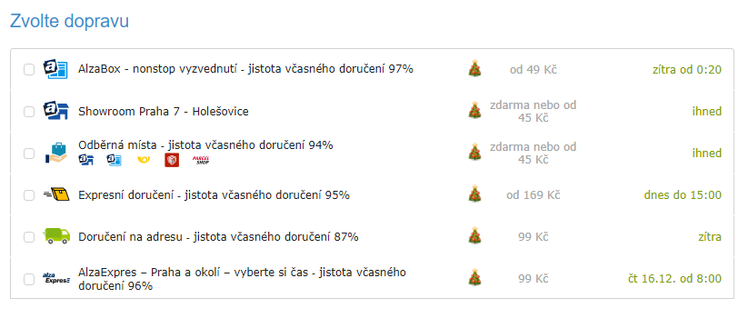 Komerční sdělení: Právě vrcholí vánoční sezona a lidé, kteří dosud odkládali nákupy dárků, by neměli déle otálet. Největší český e-shop Alza.cz nabízí širokou nabídku zboží, zákazníkům nyní ještě před dokončením objednávky transparentně ukazuje předpokládanou dobu dodání dle zvolené dopravy. AlzaBoxy jsou díky kontinuálnímu zavážení sedm dní v týdnu včetně sobot a nedělí nejrychlejším a nejspolehlivějším způsobem doručení a dárky do nich lze objednat ještě 22. prosince.