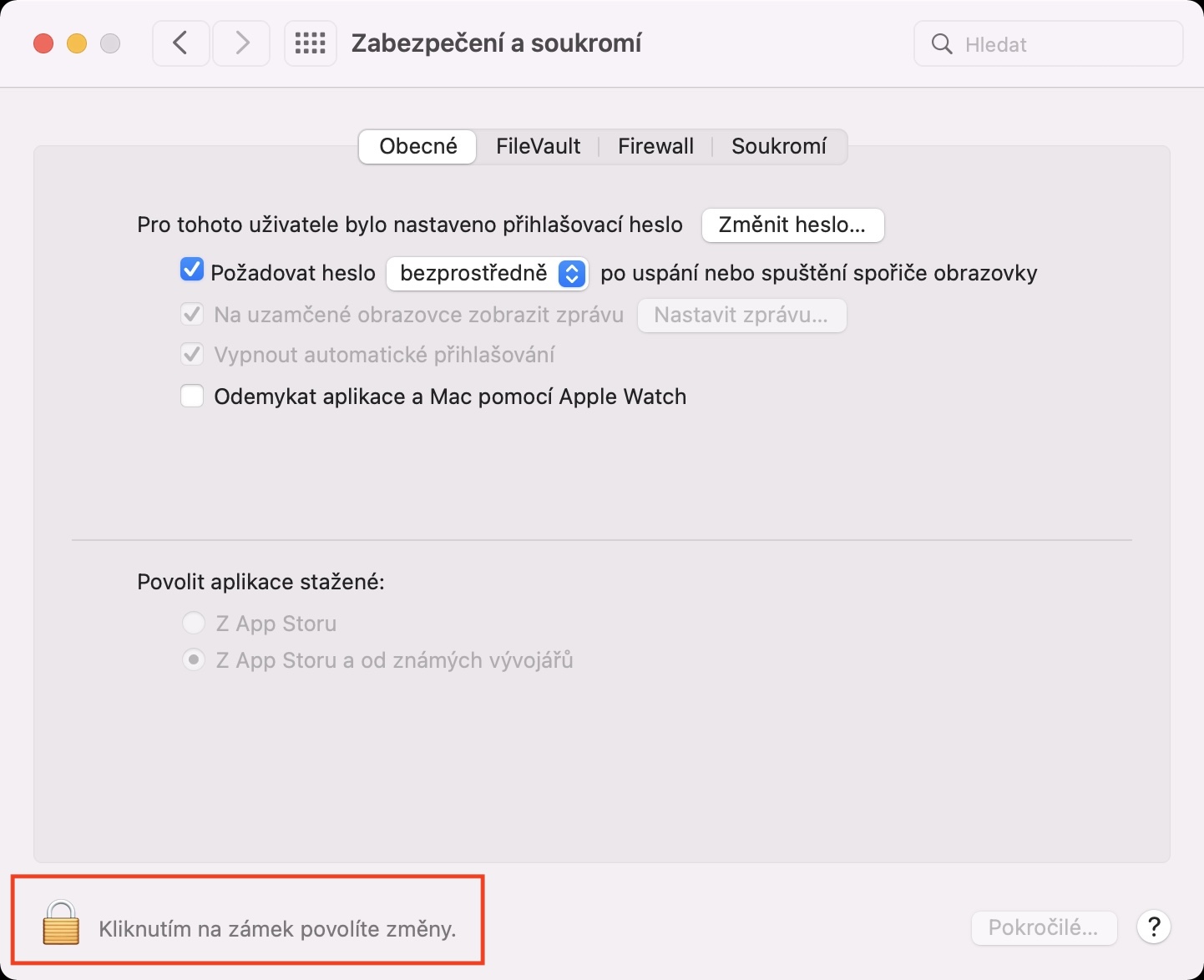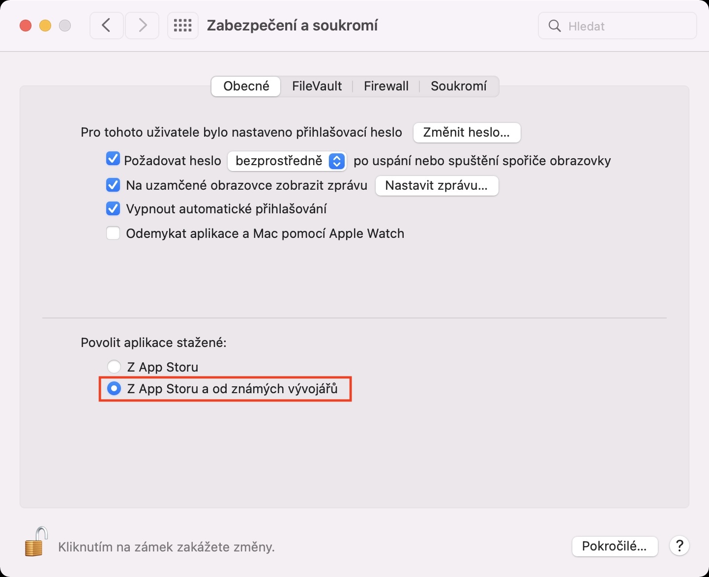 Aplikace můžete na vašem Macu jednoduše stahovat a instalovat skrze App Store, ve kterém se nachází bezpečné aplikace. Pravdou ale je, že mnoho aplikací v App Storu prostě nenajdete, jelikož je zde vývojáři neumístili. Ve výchozím nastavení je zakázáno aplikace mimo App Store instalovat, a to z bezpečnostních důvodů. Pro deaktivaci tohoto omezení stačí přejít do → Předvolby systému → Zabezpečení a soukromí, kde vlevo dole klepněte na ikonu zámku, autorizujte se, a poté zaškrtněte v sekci Povolit aplikace stažené možnost Z App Storu a od známých vývojářů.