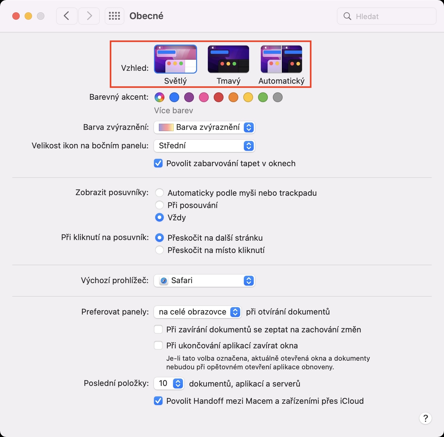 Když Mac poprvé spustíte, tak se musíte prokousat úvodním průvodcem, ve kterém si nastavíte veškeré základní záležitosti. Na konci tohoto průvodce si můžete zvolit, zdali chcete využívat světlý či tmavý režim, popřípadě jej můžete nechat automaticky střídat. Tuto změnu můžete samozřejmě kdykoliv zpětně změnit, nejedná se o nic složitého. Stačí, abyste na Macu v levém horním rohu klepnuli na → Předvolby systému → Obecné, kde nahoře Vzhled vyberte.