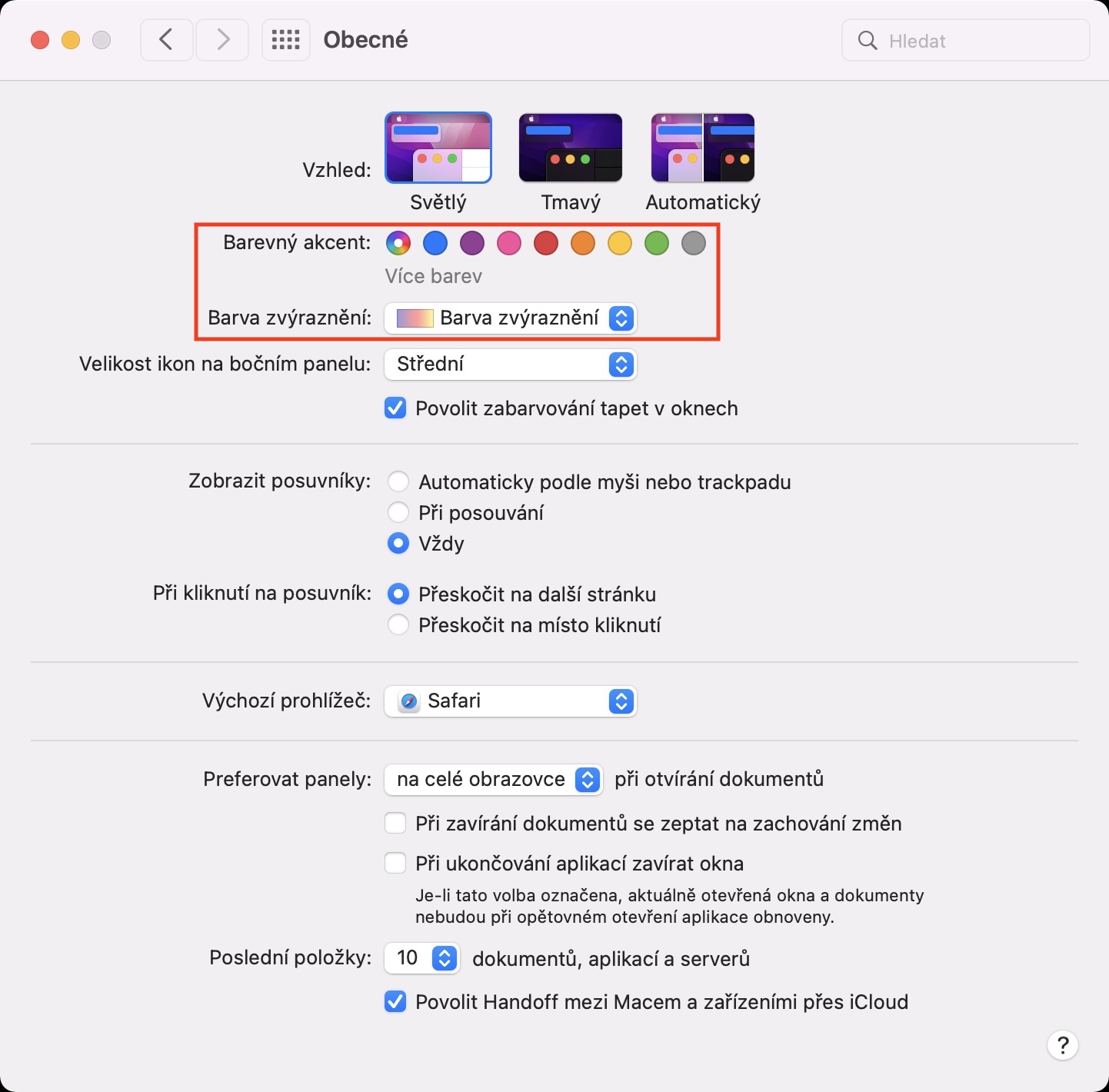 Kromě toho, že si můžete v macOS kompletně změnit vzhled, tak si můžete vybrat také akcent a zvýraznění. Touto změnou dokážete macOS kompletně odlišit od ostatních, jelikož málokdo tuto změnu vzhledu provádí. Pokud provedete změnu barvy akcentu, tak dojde ke změně barev některých ovládacích prvků apod., změnu barvy zvýraznění tak budete schopni pozorovat třeba na ploše či ve Finderu, kde označíte nějaký soubor či složku. Barevný akcent a zvýraznění můžete jednoduše změnit v → Předvolby systému → Obecné.
