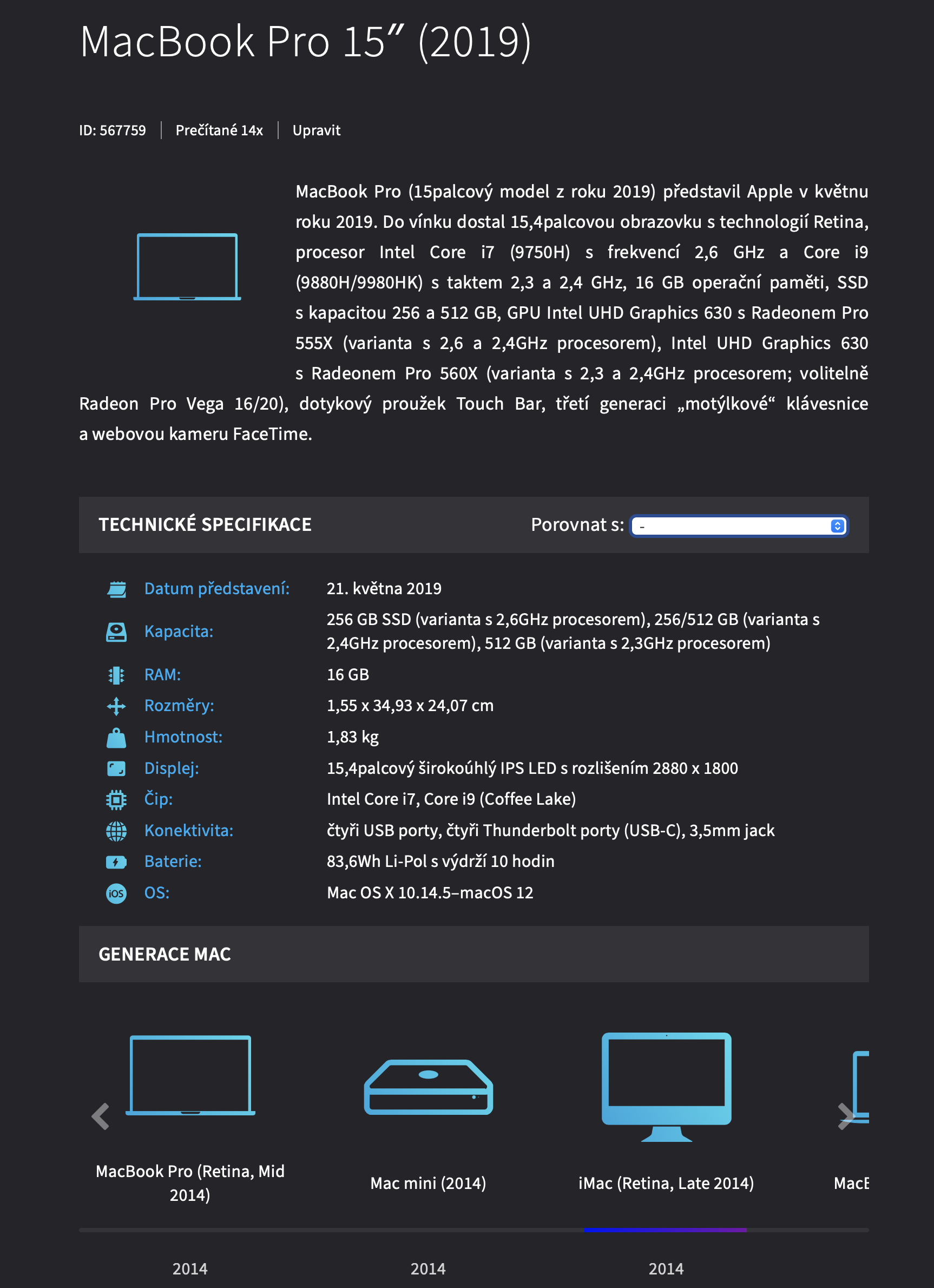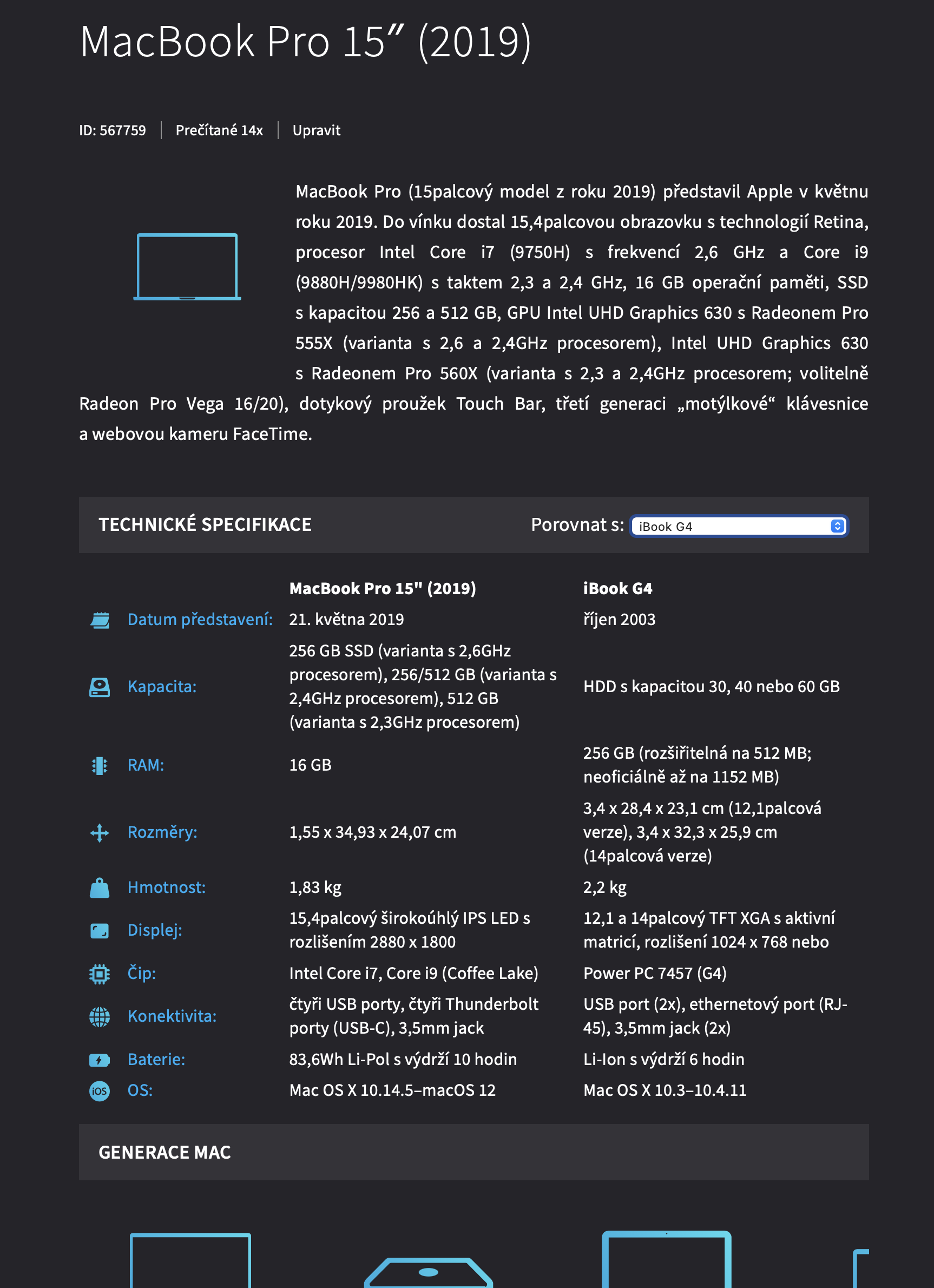 Kromě základního popisku jednotlivých produktů zde najdete také technické specifikace, které je možné v rámci kategorií srovnávat. Můžete si tak srovnat například iPhone 13 a iPhone 12 nebo, co je ještě zajímavější, podívat se na srovnání nejnovějšího MacBooku s 20 let starým strojem a okamžitě uvidíte, jak obrovský posun technologie za tu dobu udělaly. U každého produktu také vidíte jaké další produkty Apple ve stejném roce představil a aby toho nebylo málo, máte k dispozici časovou osu, na které vidíte předchozí a následující generace v rámci kategorie daného produktu.