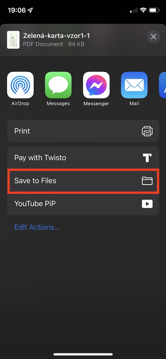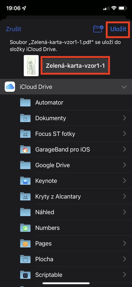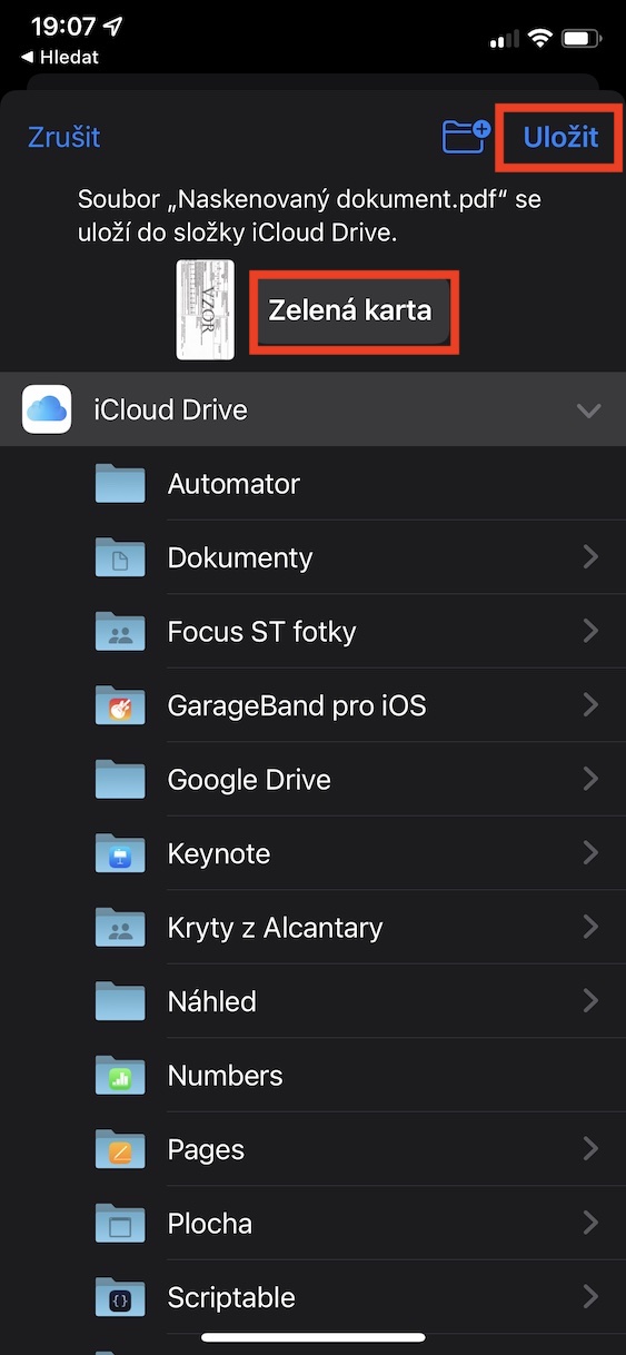 - Pak se ocitnete v aplikaci Soubory, kde si zvolte název dokumentu (třeba Zelená karta) a uložte jej na místo, kde jej najdete.