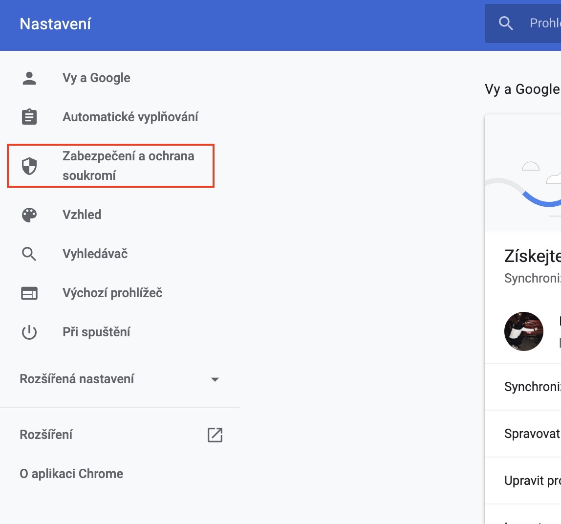 - Následně se ocitnete v rozhraní pro správu nastavení, kde vpravo stiskněte možnost Zabezpečení a ochrana soukromí.