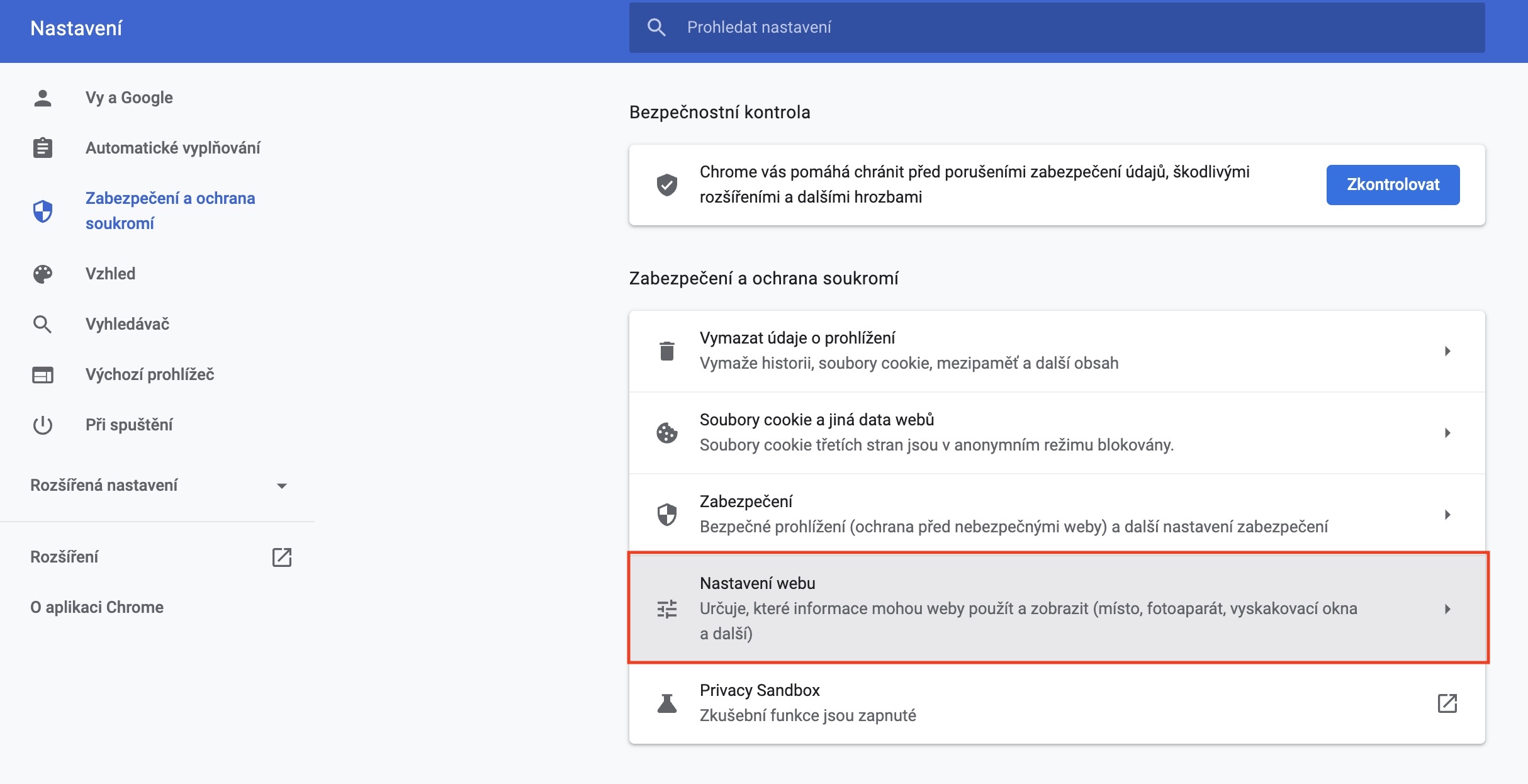 - Poté v seznamu možností vyhledejte sekci Nastavení webu a klepněte na ni.