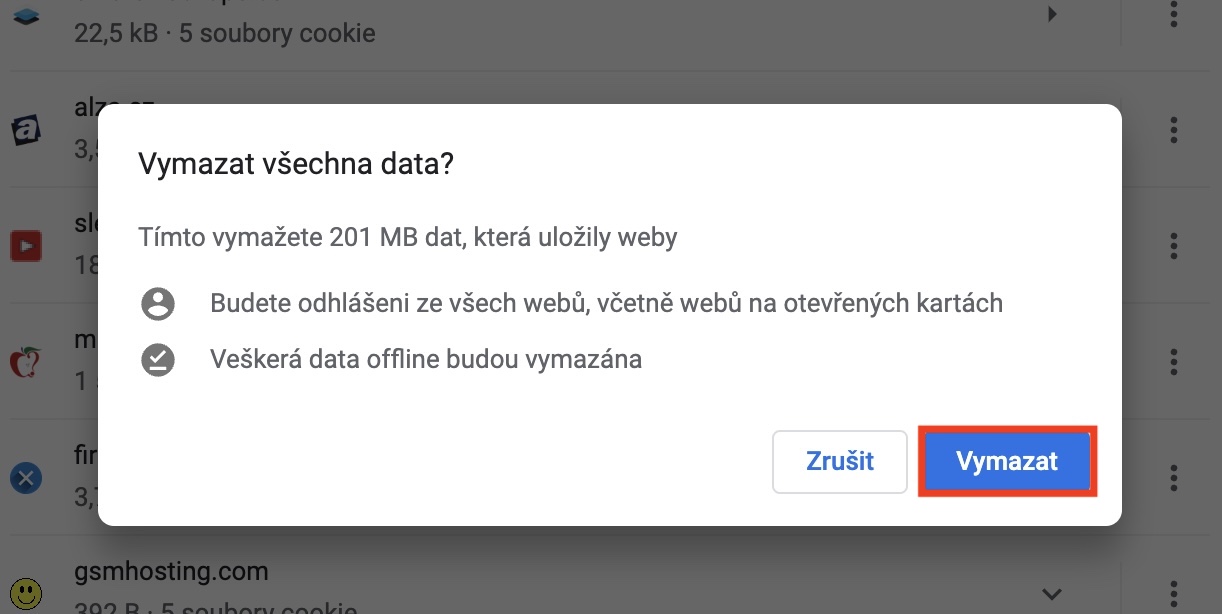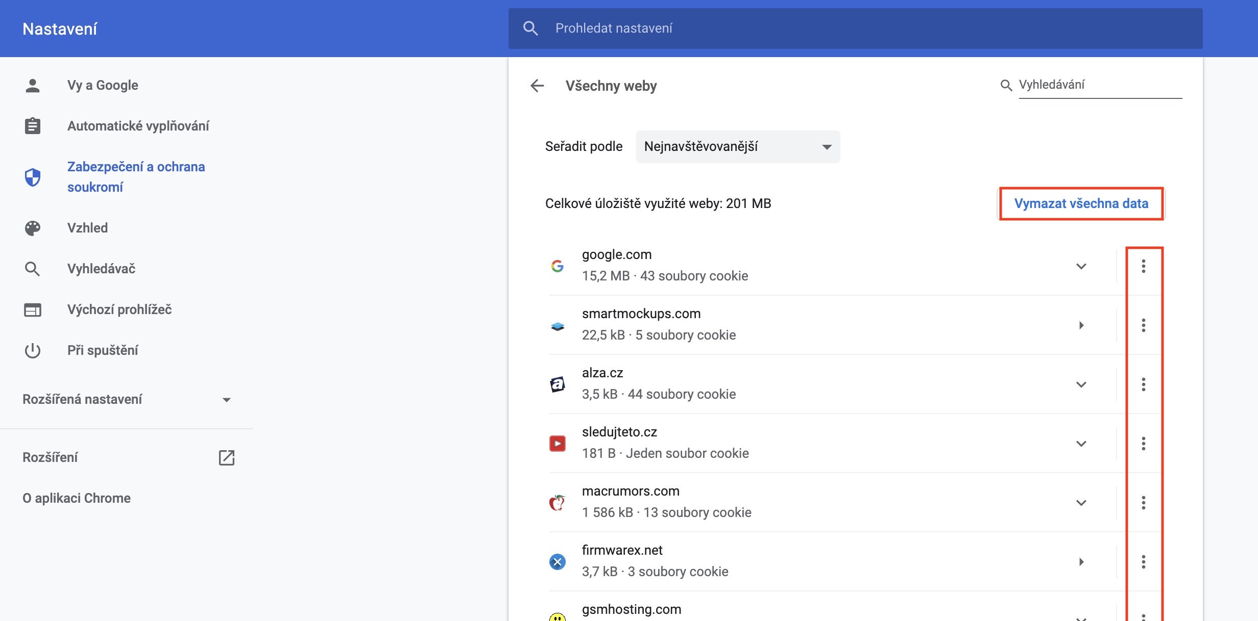 - Zde už je možné cookies a další data smazat zvlášť pro každý web anebo kompletně.