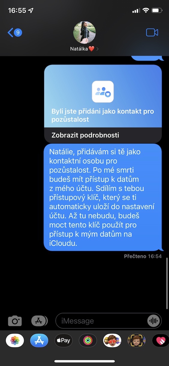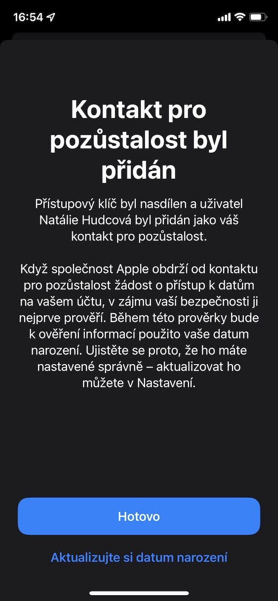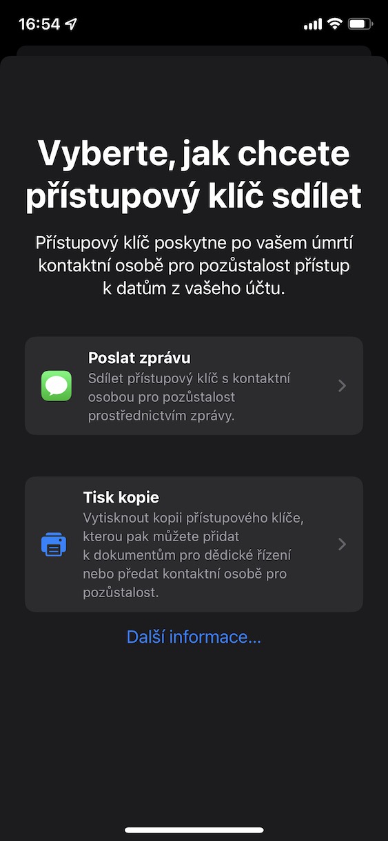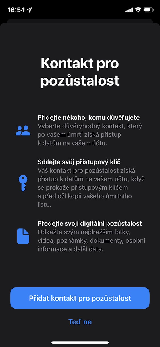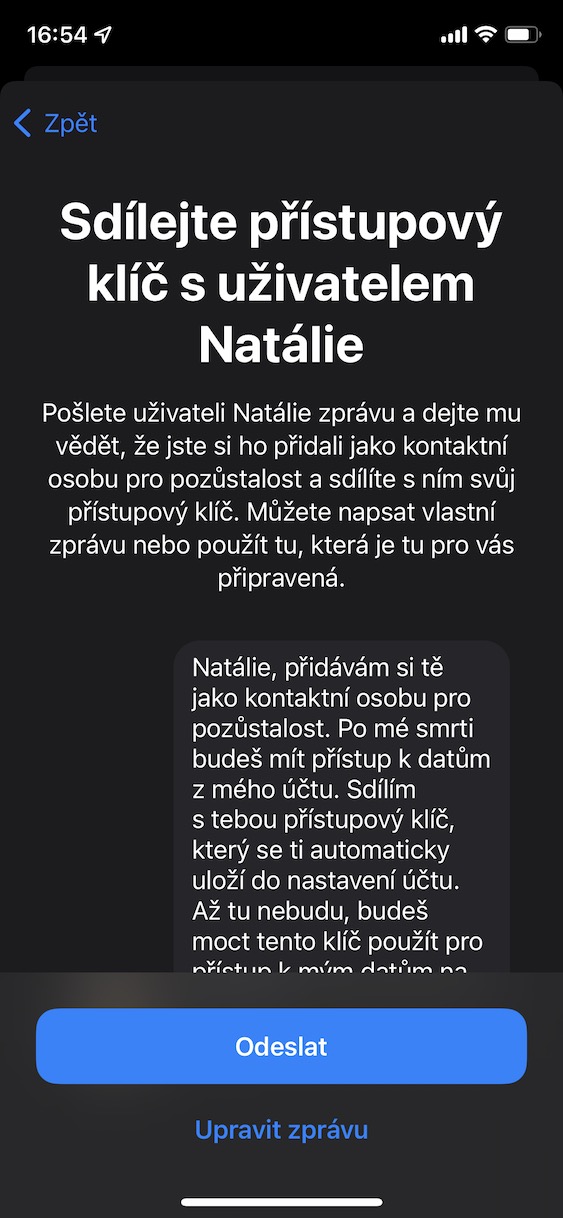 Výše uvedeným způsobem je tedy možné na vašem iPhonu nastavit kontaktní osoby pro pozůstalost. V průvodci si prvně vyberete osobu, které důvěřujete – například z rodinného sdílení, není to ale podmínkou, může se jednat o kohokoliv. Následně je nutné výběr potvrdit, a poté vybrat způsob pro zaslání přístupového klíče. V případě vaší smrti pak bude stačit, aby tento přístupový klíč, společně s úmrtním listem, kontaktní osoba doložila, čímž získá přístup k vašim datům. Pokud si vás někdo přidá jakožto kontaktní osobu pro pozůstalost, tak přístupový klíč k datům dotyčného najdete v Nastavení → váš účet → Heslo a zabezpečení → Kontaktní osoba pro pozůstalost.