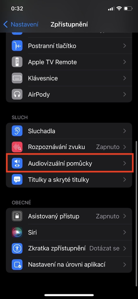 - Následně se opět přesuňte směrem dolů, tentokrát ke kategorii Sluch.
