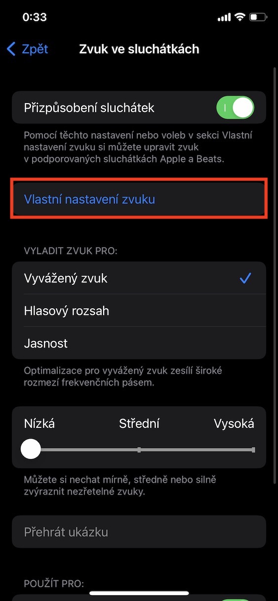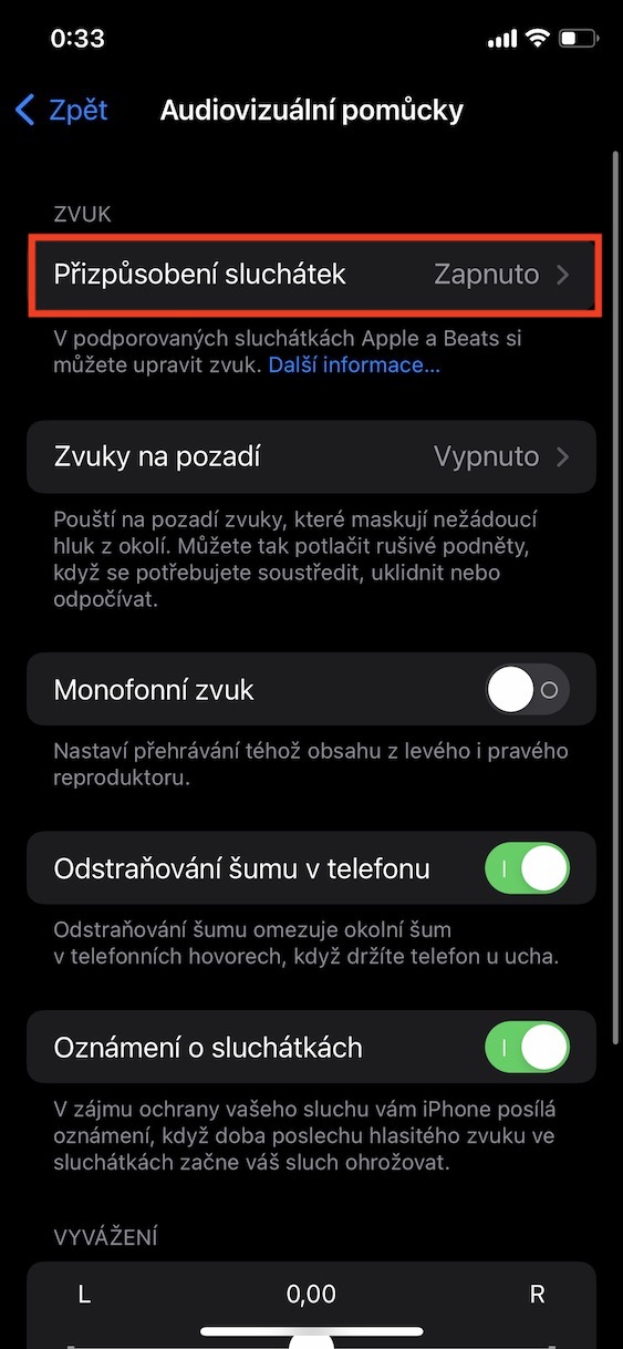 - Zde pak pomocí přepínače funkci Přizpůsobení sluchátek aktivujte.