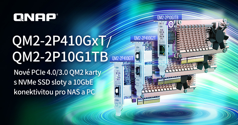 Tisková zpráva: Společnost QNAP® Systems, Inc., přední inovátor v oblasti výpočetních, síťových a úložných řešení, představila karty QM2-2P410G1T a QM2-2P410G2T PCIe Gen 4 a kartu QM2-2P10G1TB PCIe Gen 3. Všechny tři karty PCIe umožňují přidat sloty M.2 NVMe SSD a připojení 10GbE ke QNAP NAS nebo PC/serveru/pracovní stanici bez nutnosti instalace ovladačů. Uživatelé NAS mohou zlepšit celkový výkon NAS díky SSD cache a upgradovat úložnou kapacitu NAS, aniž by došlo k zabrání 3,5″ diskových pozic. Uživatelé PC/serverů/pracovních stanic mohou zvýšit svou úložnou kapacitu a zároveň zvýšit celkový výkon IOPS odložením úkolů náročných na šířku pásma na SSD, aby se minimalizovaly doby načítání aplikací.