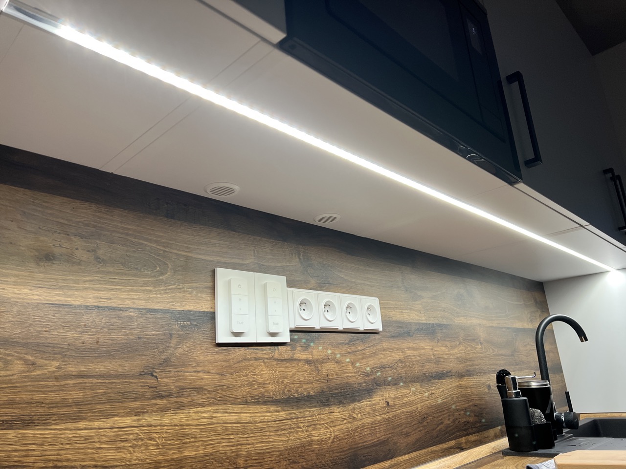 Právě jednoduchost pro mě byla extrémně důležitým faktorem i z hlediska instalace. Nejsem sice ten typ, který si neumí zapojit světlo, žárovku, popřípadě pospojovat dráty pod vypínači, ale abych byl upřímný, vždy jsem radši, když můžu použít řešení, které podobných zásahů vyžaduje co nejméně, protože mi tak nějak přijde, že je pak i nejfunkčnější. A přesně to Hue taky splnil, jelikož u něj stačí splnit naprosté minimum podmínek. Pro světla mi vlastně stačilo jen ve vypínačových krabičkách propojit kabely tak, aby měla světla neustále přísun energie, což jim zajistí neustálou komunikaci s Bridgem a potažmo vámi. Pro Bridge zase stačí jen elektrická zásuvka spolu s eternetovou přípojkou a jste doma. A montování vypínačů Hue Dimmer Switch? Záležitost pro dítě z mateřské školky. Ve druhé verzi, která je na eshopech označována jako v2, se totiž Philips rozhodl zvětšit šířku držáku vypínače, díky čemuž tak ten rázem dokonale překryje celou vypínačovou krabičku ve zdi. Vám tedy stačí jen vzít dva šroubky a držák hezky přimontovat do otvorů v krabičkách a je hotovo. A pokud se vám toto řešení zdá pořád složité, máme tu stále možnost lepení oboustrannou lepící páskou, která je na každé zadní straně držáku již z výroby připevněna. Jedná se konkrétně o starou známou 3M, která drží jako přibitá naprosto všude – v mém případě třeba laminátová zástěna za kuchyňskou linkou a koupelnové kachličky.