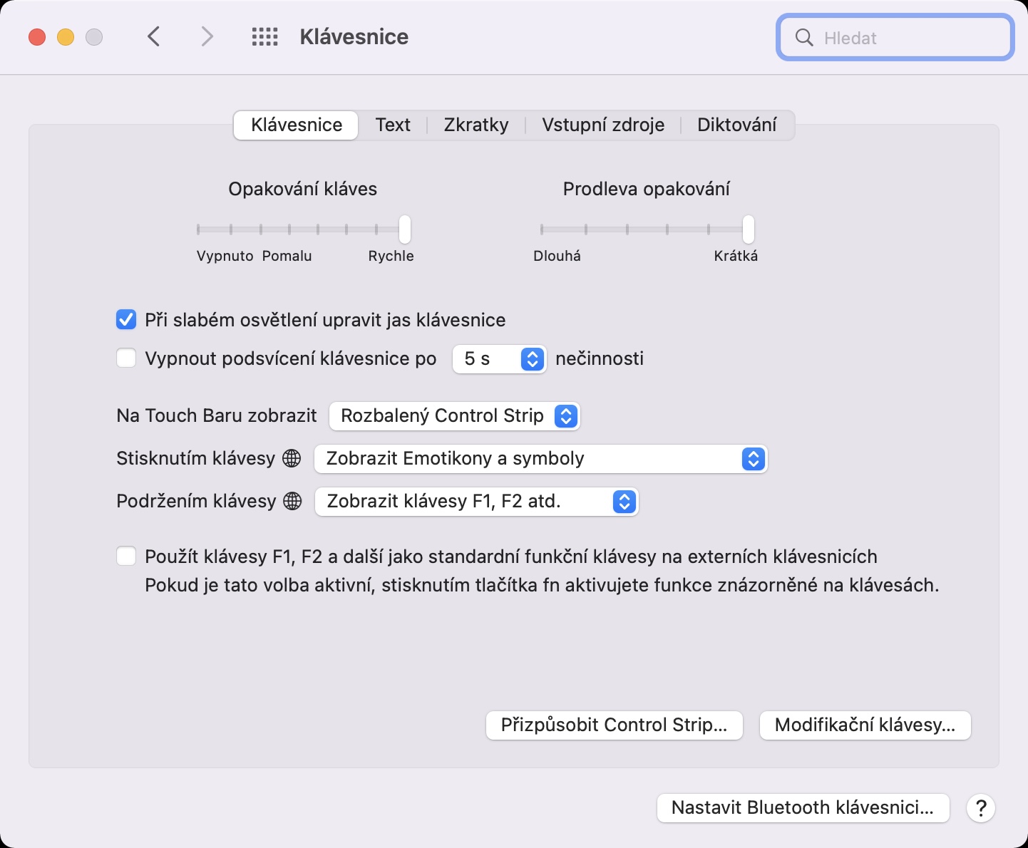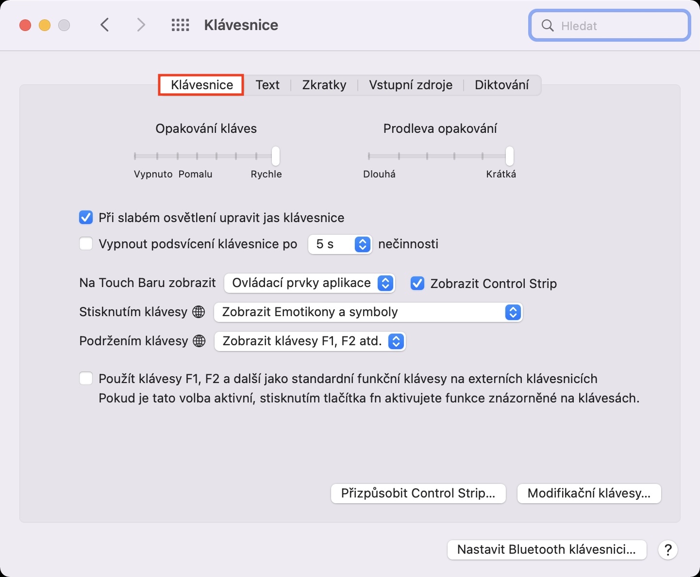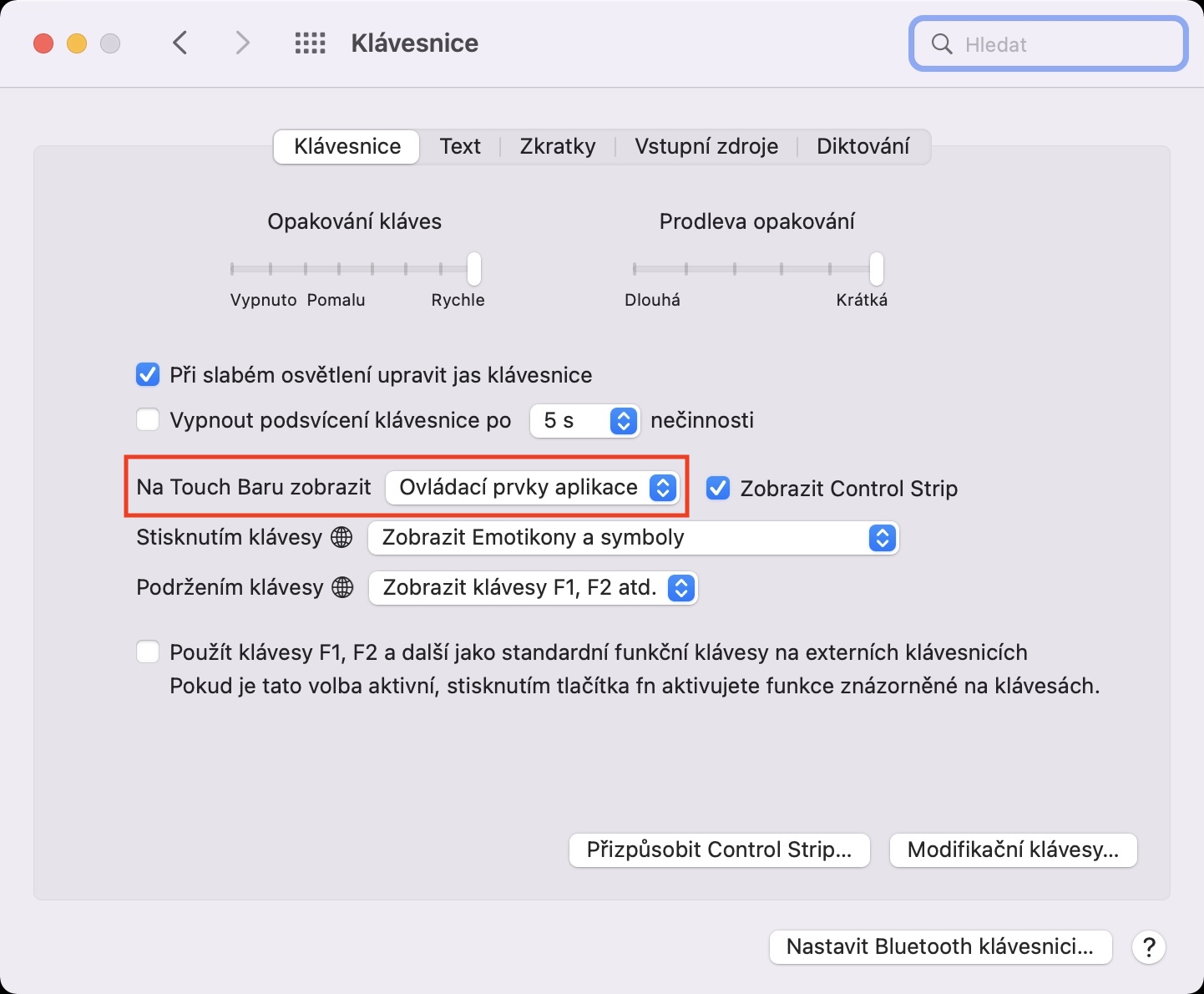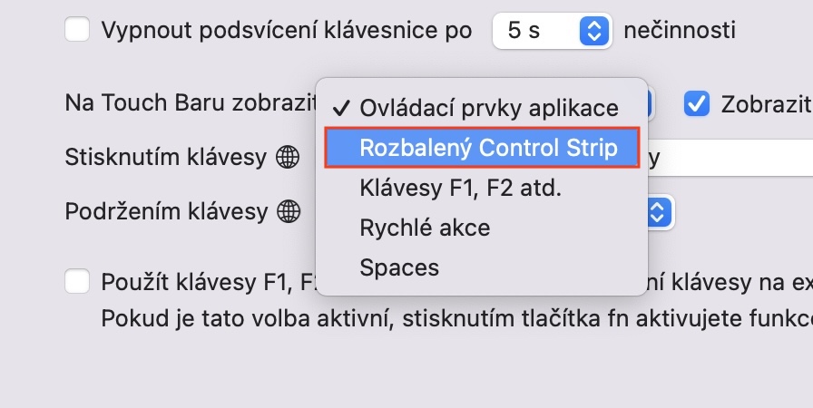Pokud provedete výše uvedený postup, tak Touch Bar ihned změní své výchozí zobrazení na rozbalený Control Strip. To znamená, že se na Touch Baru objeví klasické ovládací prvky, které jsou k dispozici u MacBooků s fyzickými klávesami v horní řadě. Pokud byste ještě chtěli docílit toho, aby se při podržení klávesy Fn (u novějších MacBooků 🌐) zobrazila řada F1, F2 atd., tak ve výše uvedené sekci rozklikněte menu vedle Podržením klávesy Fn (nebo 🌐) a vyberte Zobrazit klávesy F1, F2 atd. Výše si pak ještě můžete nastavit, co se má stát v případě, že klávesu Fn (🌐) pouze stisknete.