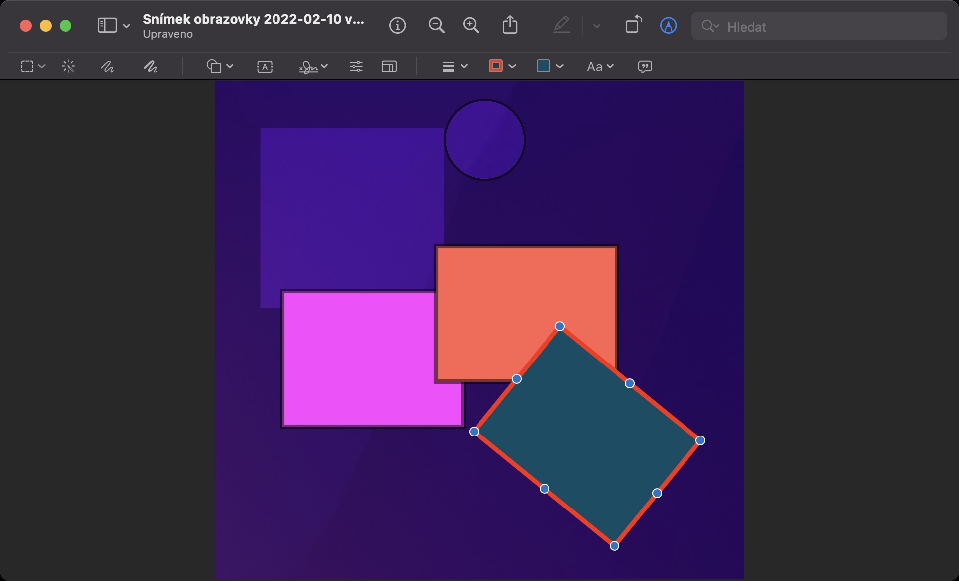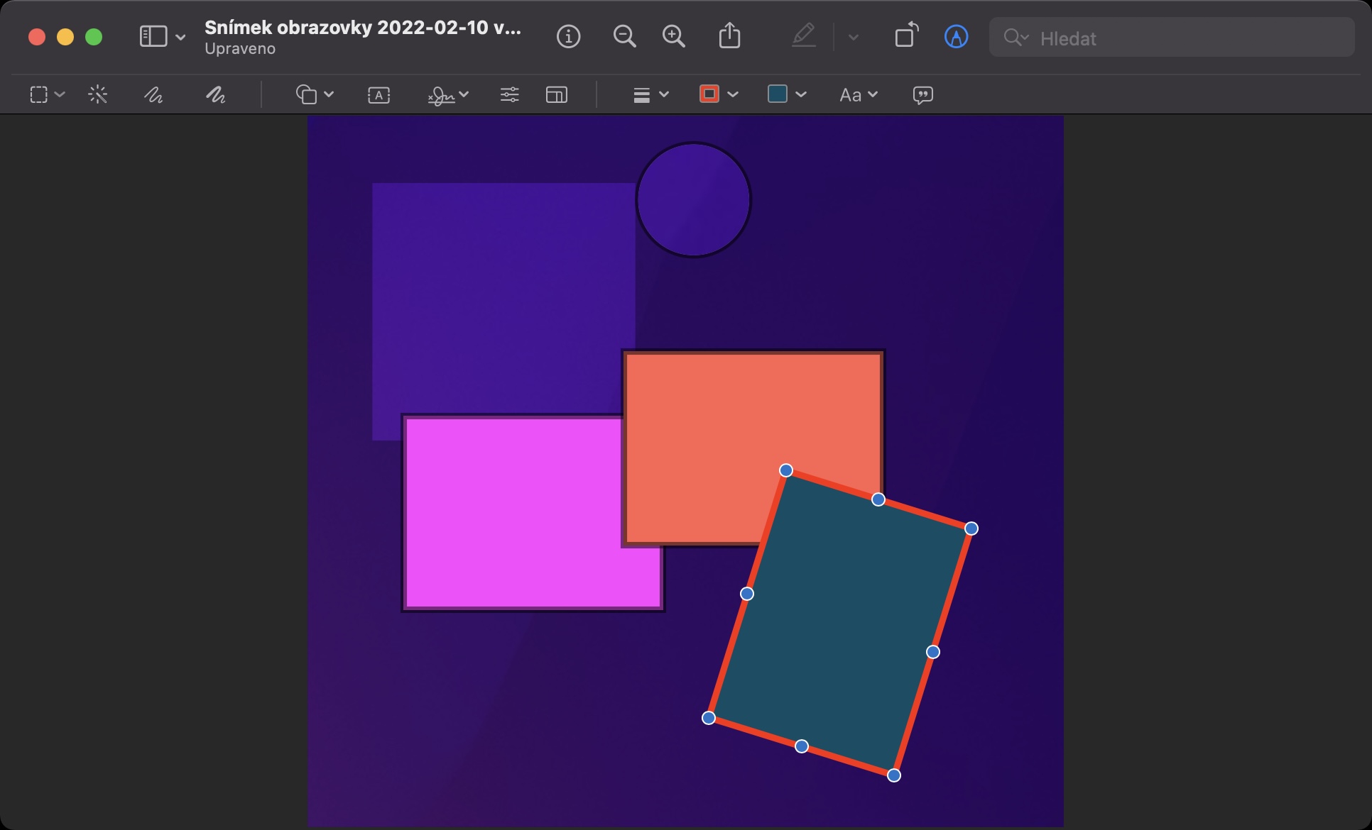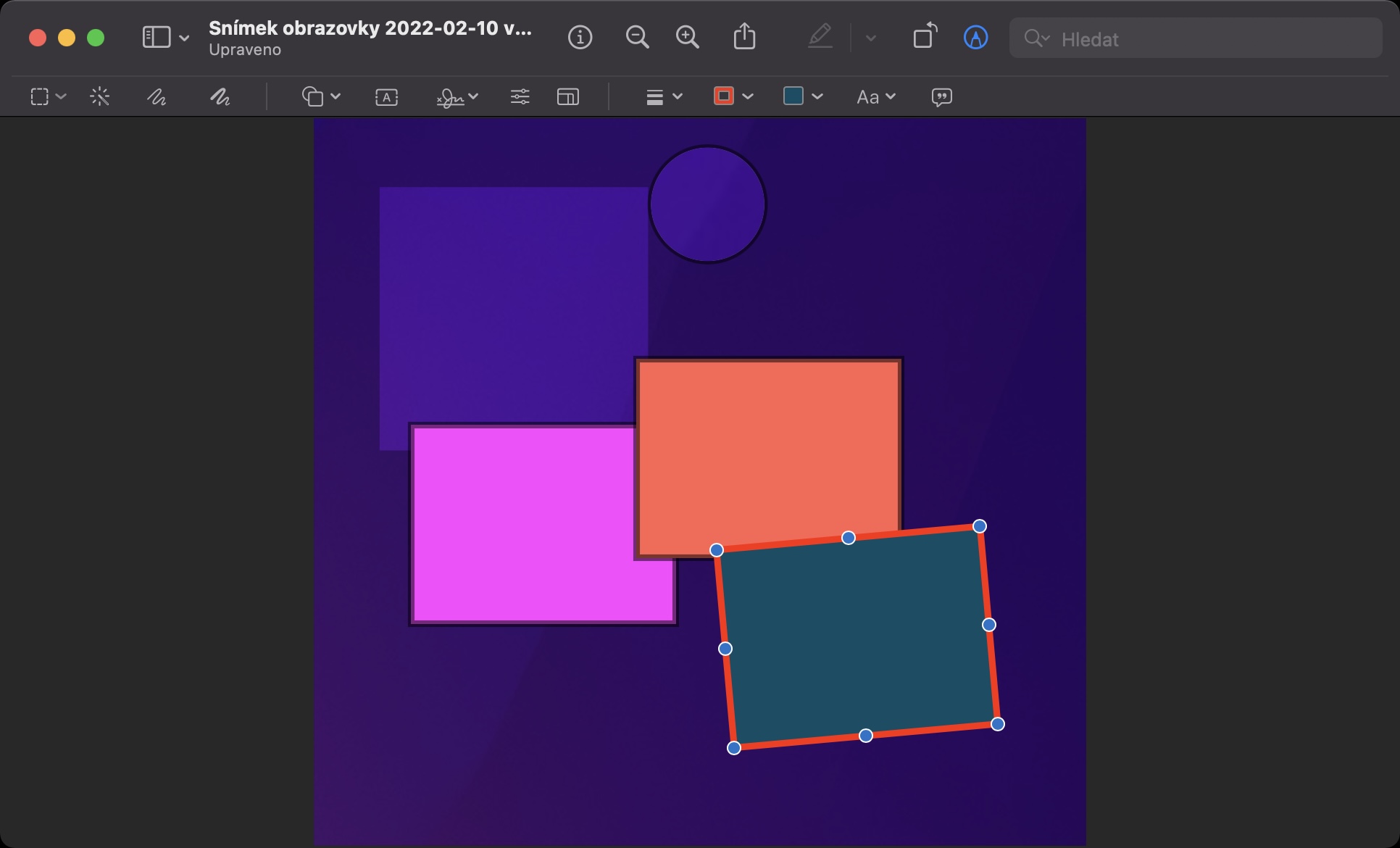 Jak už bylo zmíněno na předchozí stránce, tak Náhled můžete využít k anotacím. Při anotování můžete využít například různé tvary a text. Postupným přidáváním objektů, textu apod. však tvoříte vrstvy. To znamená, že pokud prvně vložíte do obrázku nějaký objekt, a poté přes něj vložíte další, tak ten druhý přidaný bude na popředí a zakryje původní objekt. V určitých případech by se mohlo hodit změnit pořadí těchto vrstev, aby bylo například možné starší objekt zobrazit v popředí (nebo naopak). Toho docílíte jednoduše tak, že si klepnutím objekt označíte, a poté na něj klepnete pravým. Tím se zobrazí menu, ve kterém můžete objekt přesunout vpřed či vzat, popřípadě na popředí či na pozadí.