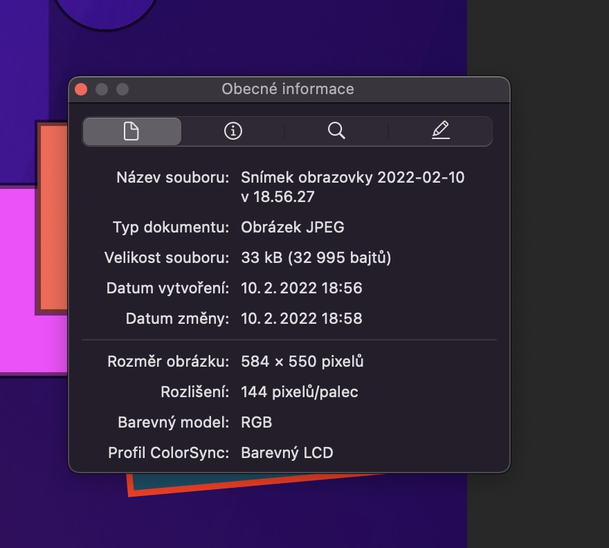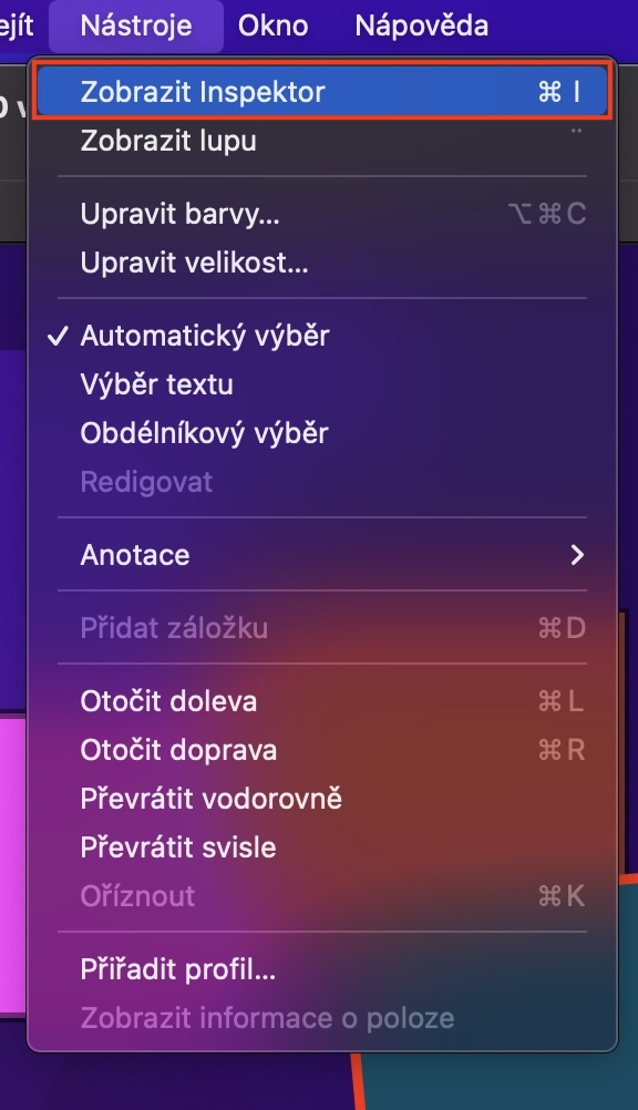 Při pořízení fotografie, popřípadě při vytvoření obrázku, se neukládá pouze obraz jako takový, ale také metadata. Pokud nevíte, co to metadata jsou, tak se jedná o data o datech, v tomto případě tedy o data o fotce či obrázku. Součástí těchto metadat je například informace o tom, jaký fotoaparát či zařízení bylo využito, jak byl nastaven objektiv, kde a kdy došlo k pořízení a mnoho dalšího. Nejvíce metadat samozřejmě zobrazíte u fotek. Pokud byste v Náhledu chtěli metadata zobrazit, tak stačí, abyste v horní liště klepnuli na záložku Nástroje, a poté vybrali Zobrazit Inspektor. Pak se ukáže nové okno, kde už si metadata můžete prohlédnout.